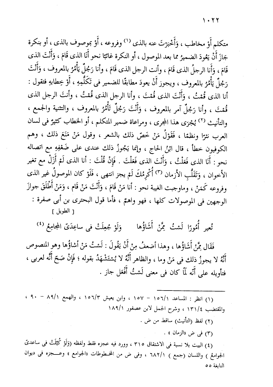 متكلم أو مخاطب، وأخيرت عنه بالذي وفروعه، أو بموصوف بالذي، أو بنكرة جاز أن يعود الضمير مما بعد الموصول، أو النكرة غائبًا نحو أنا الذي قام، وأنت الذي قام، وأنا الرجل الذي قام، وأنت الرجل الذي قام، وأنا رجل يأمر بالمعروف، وأنت رجل يأمر بالمعروف، ويجوز أن يعود مطابقًا للضمير في تكلمه، أو خطابه فتقول: أنا الذي قمت، وأنت الذي قمت، وأنا الرجل الذي قمت، وأنا رجل آمر بالمعروف، وأنت رجل تأمر بالمعروف، والتثنية والجمع، والتأنيث يجري هذا المجرى، ومراعاة ضمير المتكلم، أو الخطاب كثير في لسان العرب نثرًا ونظمًا، فقول من خص ذلك بالشعر، وقول من منع ذلك، وهم الكوفيون خطأ، قال ابن الحاج، وإنما يجوز ذلك عندي على ضعفه مع اتصاله نحو: أنا الذي فعلت، وأنت الذي فعلت. فإن قلت: أنا الذي لم أزل مع تغير الأخوان، وتقلب الأزمان أكرمك لم يجز انتهى، فلو كان الموصول غير الذي وفروعه كمن، وما وجبت الغيبة نحو: أنا من قام، وأنت من قام، ومن أطلق جواز الوجهين في الموصولات كلها، فهو واهم، فأما قول البحتري بن أبي صفرة: