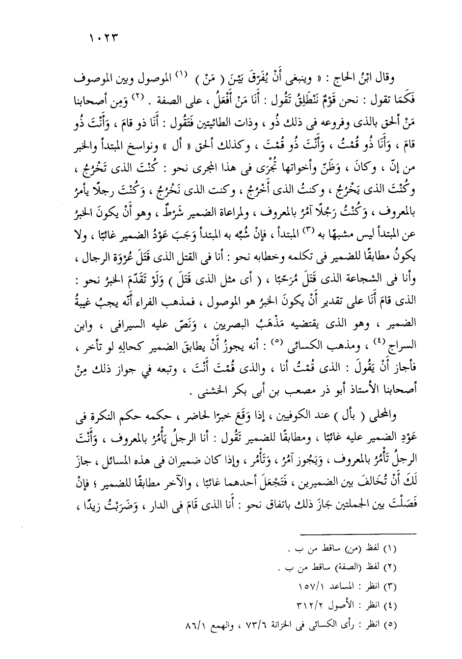 وقال ابن الحاج: «وينبغي أن يفرق بين (من) الموصول وبين الموصوف فكما تقول: نحن قوم ننطلق تقول: أنا من أفعل، على الصفة. ومن أصحابنا من ألحق بالذي وفروعه في ذلك ذو، وذات الطائيتين فتقول: أنا ذو قام، وأنت ذو قام، وأنا ذو قمت، وأنت ذو قمت، وكذلك ألحق «أل» ونواسخ المبتدأ والخبر من إن، وكان، وظن وأخواتها تجرى في هذا المجرى نحو: كنت الذي تخرج، وكنت الذي يخرج، وكنت الذي أخرج، وكنت الذي نخرج، وكنت رجلاً يأمر بالمعروف، وكنت رجلاً آمر بالمعروف، ولمراعاة الضمير شرط، وهو أن يكون الخبر عن المبتدأ ليس مشبهًا به المبتدأ، فإن شبه به المبتدأ وجب عود الضمير غائبًا، ولا يكون مطابقًا للضمير في تكلمه وخطابه نحو: أنا في القتل الذي قتل عروة الرجال، وأنا في الشجاعة الذي قتل مرحبًا، (أي مثل الذي قتل) ولو تقدم الخبر نحو: الذي قام أنا على تقدير أن يكون الخبر هو الموصول، فمذهب الفراء أنه يجب غيبة الضمير، وهو الذي يقتضيه مذهب البصريين، ونص عليه السيرافي، وابن السراج، ومذهب الكسائي: أنه يجوز أن يطابق الضمير كحاله لو تأخر، فأجاز أن يقول: الذي قمت أنا، والذي قمت أنت، وتبعه في جواز ذلك من أصحابنا الأستاذ أبو ذر مصعب بن أبي بكر الخشني.