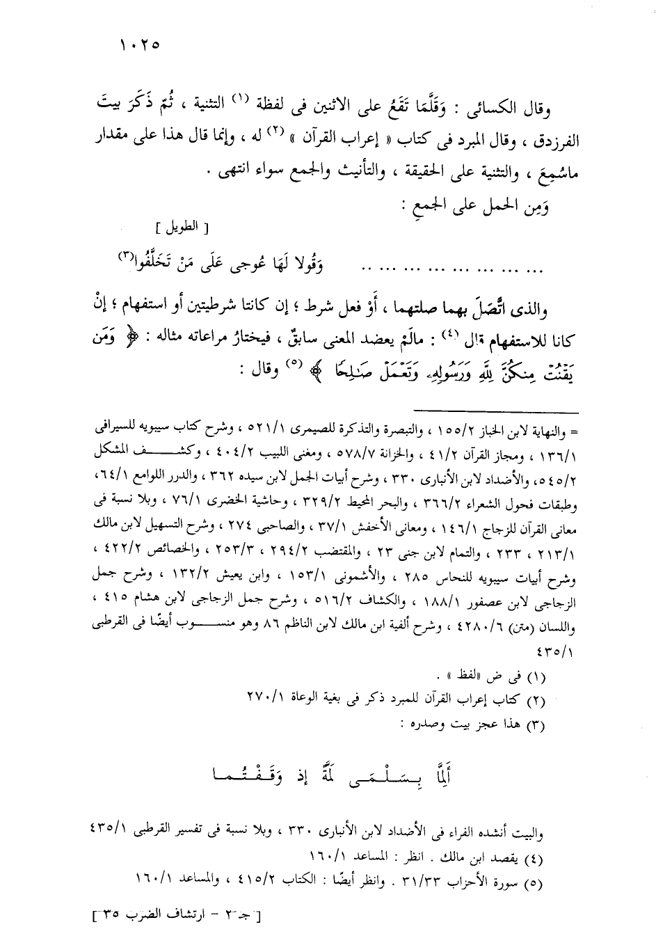 وقال الكسائي: وقلما تقع على الاثنين في لفظة التثنية، ثم ذكر بيت الفرزدق، وقال المبرد في كتاب «إعراب القرآن» له، وإنما قال هذا على مقدار ما سمع، والتثنية على الحقيقة، والتأنيث والجمع سواء انتهى.