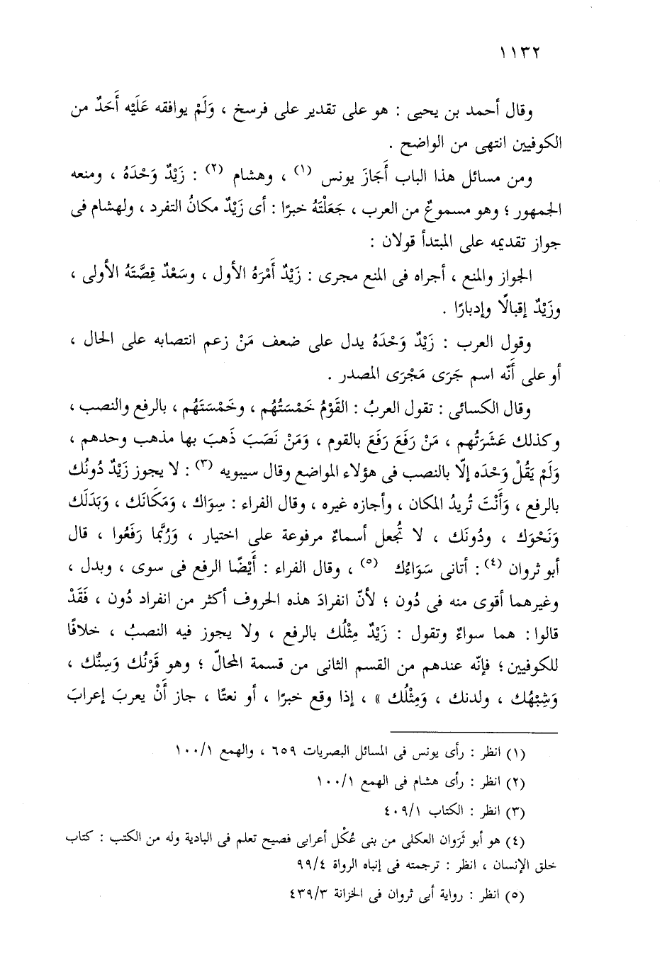 وقول العرب: زيد وحده يدل على ضعف من زعم انتصابه على الحال، أو على أنه اسم جرى مجرى المصدر.