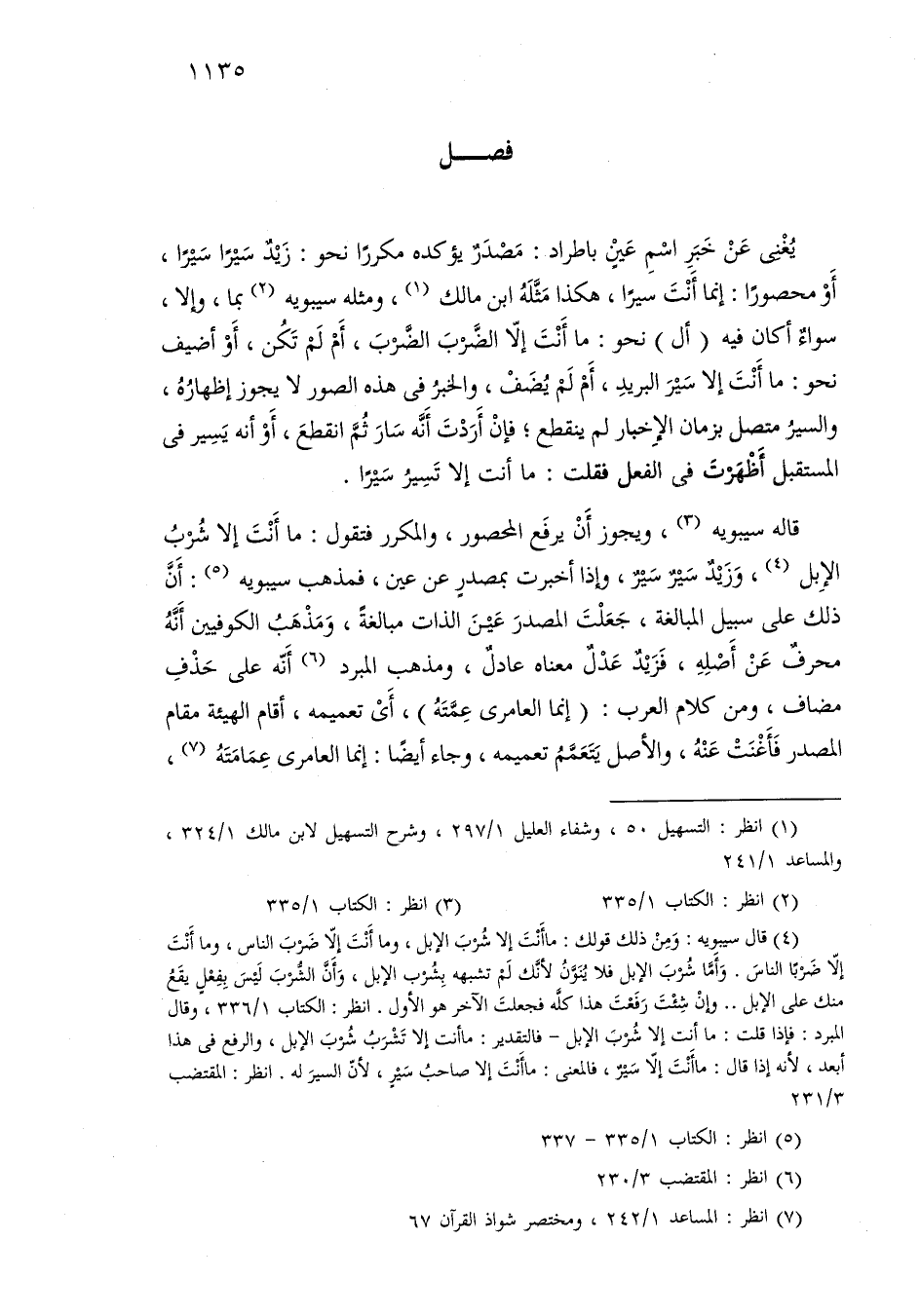 قاله سيبويه، ويجوز أن يرفع المحصور، والمكرر فتقول: ما أنت إلا شرب الإبل، وزيد سير سير، وإذا أخبرت بمصدر عن عين، فمذهب سيبويه: أن ذلك على سبيل المبالغة، جعلت المصدر عين الذات مبالغة، ومذهب الكوفيين أنه محرف عن أصله، فزيد عدل معناه عادل، ومذهب المبرد أنه على حذف مضاف، ومن كلام العرب: (إنما العامري عمته)، أي تعميمه، أقام الهيئة مقام المصدر فأغنت عنه، والأصل يتعمم تعميمه، وجاء أيضًا: إنما العامري عمامته،