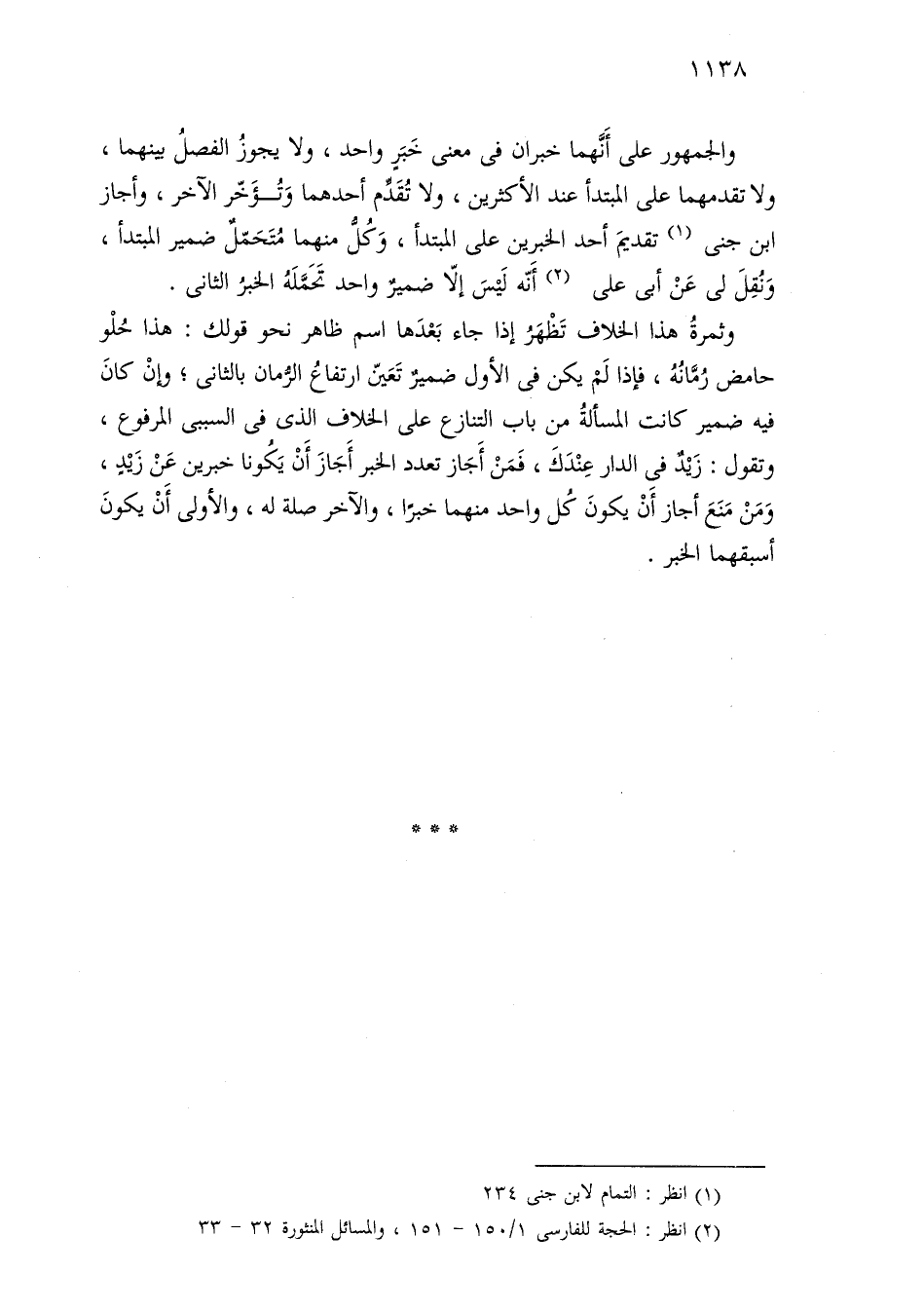والجمهور على أنهما خبران في معنى خبر واحد، ولا يجوز الفصل بينهما، ولا تقدمهما على المبتدأ عند الأكثرين، ولا تقدم أحدهما وتؤخر الآخر، وأجاز ابن جني تقديم أحد الخبرين على المبتدأ، وكل منهما متحمل ضمير المبتدأ، ونقل لي عن أبي علي أنه ليس إلا ضمير واحد تحمله الخبر الثاني.