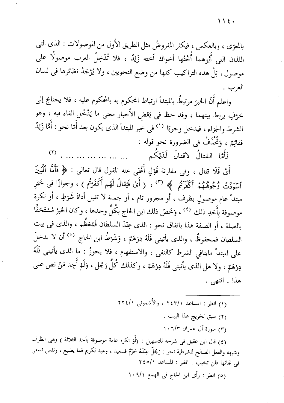 أي فلا قتال، وفي مقارنة قول أغنى عنه المقول قال تعالى: {فأما الذين أسودت وجوههم أكفرتم}، (أي فيقال لهم أكفرتم)، وجوازًا في خبر مبتدأ عام موصول بظرف، أو مجرور تام، أو جملة لا تقبل أداة شرط، أو نكرة موصوفة بأحد ذلك، وخص ذلك ابن الحاج بكل وحدها، وكان الخبر مستحقًا بالصلة، أو الصفة هذا باتفاق نحو: الذي عند السلطان فمعظم، والذي في بيت السلطان فمحفوظ، والذي يأتيني فله درهم، وشرط ابن الحاج أن لا يدخل على المبتدأ ما ينافي الشرط كالنفي، والاستفهام، فلا يجوز: ما الذي يأتيني فله درهم، ولا هل الذي يأتيني فله درهم، وكذلك كل رجل، ولم أجد من نص على هذا. انتهى.