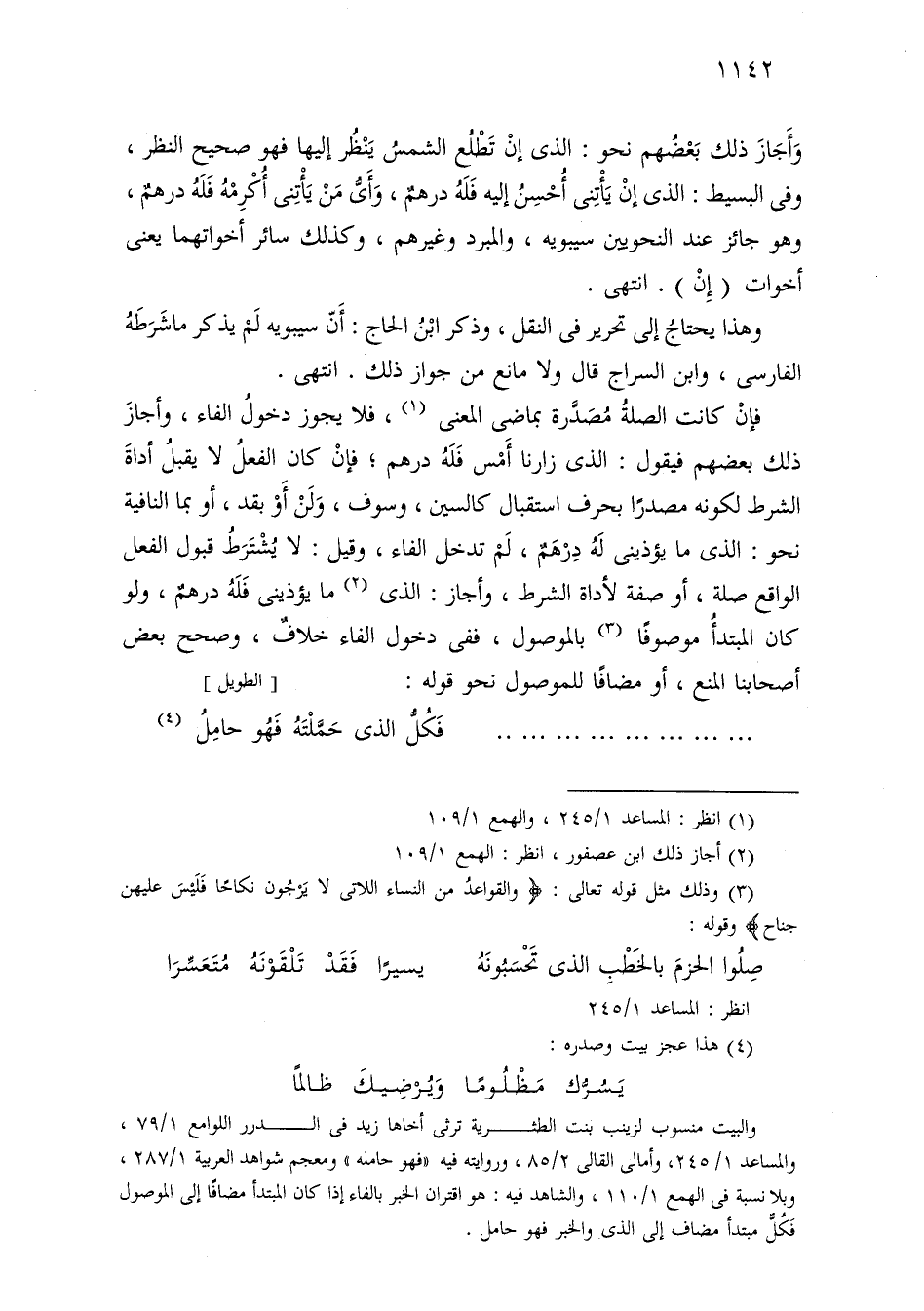 وأجاز ذلك بعضهم نحو: الذي إن تطلع الشمس ينظر إليها فهو صحيح النظر، وفي البسيط: الذي إن يأتني أحسن إليه فله درهم، وأي من يأتني أكرمه فله درهم، وهو جائز عند النحويين سيبويه، والمبرد وغيرهم، وكذلك سائر أخواتهما يعني أخوات (إن). انتهى.