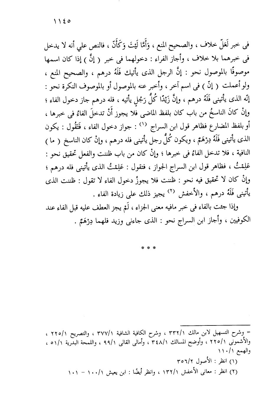 في خبر لعل خلاف، والصحيح المنع، وأما ليت وكأن، فالنص على أنه لا يدخل في خبرهما بلا خلاف، وأجاز الفراء: دخولهما في خبر (إن) إذا كان اسمها موصوفًا بالموصول نحو: إن الرجل الذي يأتيك فله درهم، والصحيح المنع، ولو أعملت (إن) في اسم آخر، وأخبر عنه بالموصول أو بالموصوف النكرة نحو: إنه الذي يأتيني فله درهم، وإن زيدًا كل رجل يأتيه، فله درهم جاز دخول الفاء؛ وإن كان الناسخ من باب كان بلفظ الماضي فلا يجوز أن تدخل الفاء في خبرها، أو بلفظ المضارع فظاهر قول ابن السراج: جواز دخول الفاء، فتقول: يكون الذي يأتيني فله درهم، ويكون كل رجل يأتيني فله درهم، وإن كان الناسخ (ما) النافية، فلا تدخل الفاء في خبرها؛ وإن كان من باب ظننت والفعل تحقيق نحو: علمت، فظاهر قول ابن السراج الجواز، فتقول: علمت الذي يأتيني فله درهم؛ وإن كان لا تحقيق فيه نحو: ظننت فلا يجوز دخول الفاء لا تقول: ظننت الذي يأتيني فله درهم، والأخفش يجيز ذلك على زيادة الفاء.