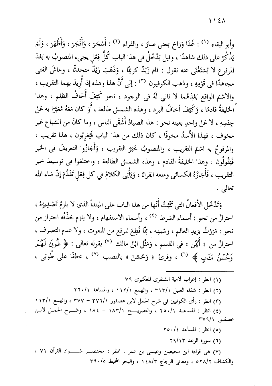 وأبو البقاء: غدا وراح بمعنى صار، والفراء: أسحر، وأفجر، وأظهر، ولم يذكر على ذلك شاهدًا، وقيل يدخل في هذا الباب كل فعل يجيء المنصوب به بعد المرفوع لا يستغنى عنه تقول: قام زيد كريمًا، وذهب زيد متحدثًا، وعاش الفتى مجاهدًا في قومه، وذهب الكوفيون: إلى أن هذا وهذه إذا أريد بهما التقريب، والاسم الواقع بعدهما لا ثاني له في الوجود، نحو كيف أخاف الظلم، وهذا الخليفة قادمًا، وكيف أخاف البرد، وهذه الشمس طالعة، أو كان معه معبرًا به عن جنسه، لا عن واحد بعينه نحو: هذا الصياد أشقى الناس، وما كان من السباع غير مخوف، فهذا الأسد مخوفًا، كان ذلك من هذا الباب فيعربون، هذا تقريب، والمرفوع به اسم التقريب، والمنصوب خبر التقريب، وأجازوا التعريف في الخبر فيقولون: وهذا الخليفة القادم، وهذه الشمس الطالعة، واختلفوا في توسيط خبر التقريب، فأجازه الكسائي ومنعه الفراء، ويأتي الكلام في كل فعل تقدم إن شاء الله تعالى.