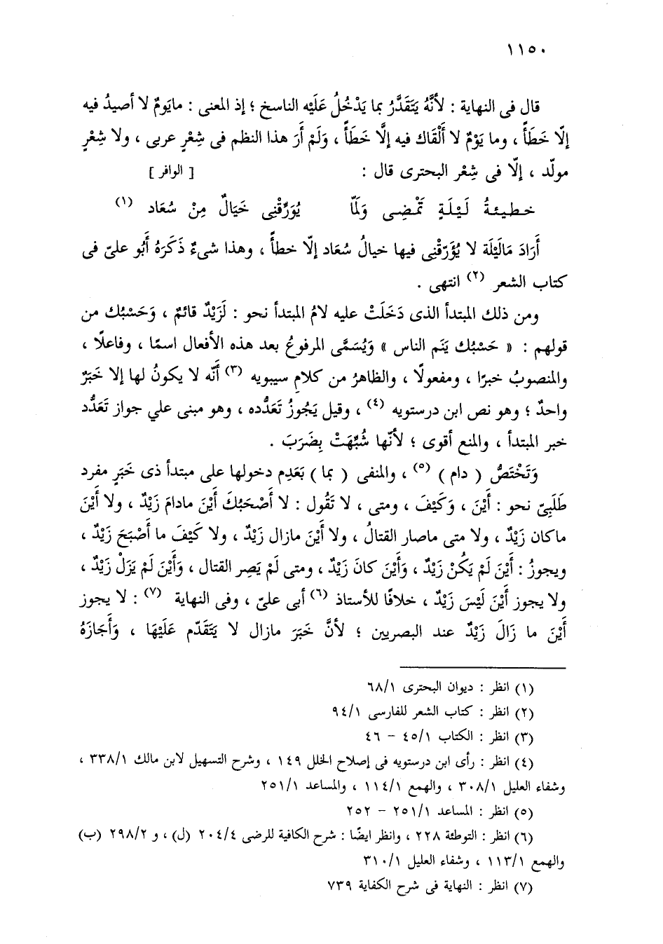 قال في النهاية: لأنه يتقدر بما يدخل عليه الناسخ؛ إذ المعنى: ما يوم لا أصيد فيه إلا خطأ، وما يوم لا ألقاك فيه إلا خطأ، ولم أر هذا النظم في شعر عربي، ولا شعر مولد، إلا في شعر البحتري قال: