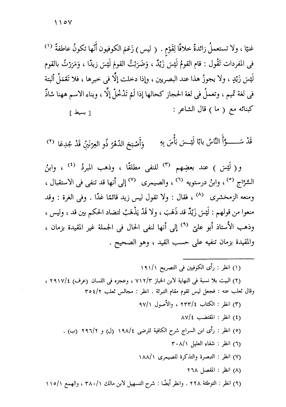 و (ليس) عند بعضهم للنفي مطلقًا، وذهب المبرد، وابن السراج، وابن درستويه، والصيمري إلى أنها قد تنفى في الاستقبال، ومنعه الزمخشري، فقال: ولا تقول ليس زيد قائمًا غدًا. وفي الغرة: وقد منعوا من قولهم: ليس زيد قد ذهب، ولا قد يذهب لتضاد الحكم بين قد، وليس، وذهب الأستاذ أبو علي إلى أنها لنفي الحال في الجملة غير المقيدة بزمان، والمقيدة بزمان تنفيه على حسب القيد، وهو الصحيح