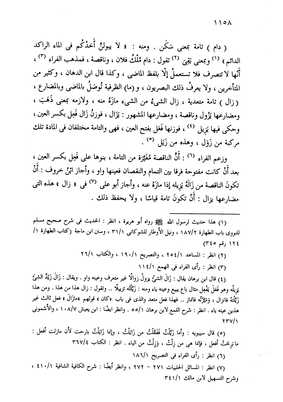(دام) تامة بمعنى سكن. ومنه: «لا يبولن أحدكم في الماء الراكد الدائم» وبمعنى بقى تقول: دام ملك فلان، وناقصة، فمذهب الفراء، أنها لا تتصرف فلا تستعمل إلا بلفظ الماضي، وكذا قال ابن الدهان، وكثير من المتأخرين، ولا يعرف ذلك البصريون، و (ما) الظرفية توصل بالماضي وبالمضارع، (زال) تامة متعدية، زال الشيء من الشيء مازه منه، ولازمه بمعنى ذهب، ومضارعها يزول وناقصة، ومضارعها المشهور: يزال، فوزن زال فعل بكسر العين، وحكى فيها يزيل، فوزنها فعل بفتح العين، فهي والتامة مختلفان في المادة تلك مركبة من زول، وهذه من زيل.