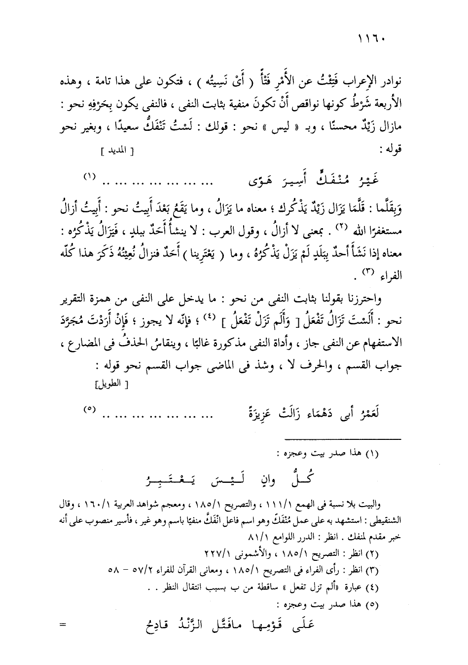 نوادر الإعراب فئت عن الأمر فتأ (أي نسيته)، فتكون على هذا تامة، وهذه الأربعة شرط كونها نواقص أن تكون منفية بثابت النفي، فالنفي يكون بحرفه نحو: ما زال زيد محسنًا، وبـ «ليس» نحو: قولك: لست تنفك سعيدًا، وبغير نحو قوله: