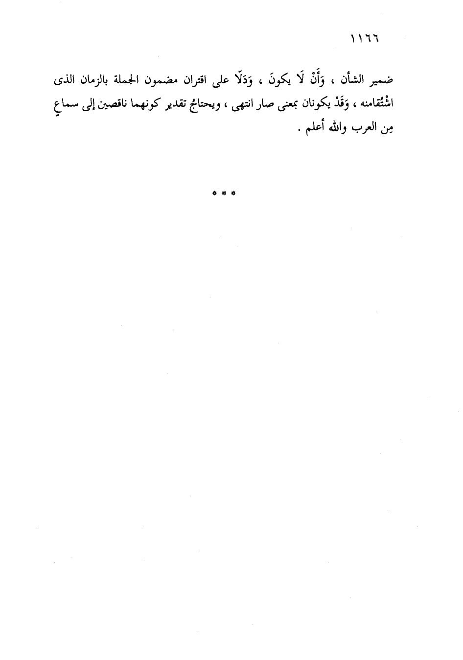 ضمير الشأن، وأن لا يكون، ودلا على اقتران مضمون الجملة بالزمان الذي اشتقا منه، وقد يكونان بمعنى صار انتهى، ويحتاج تقدير كونهما ناقصين إلى سماع من العرب والله أعلم.