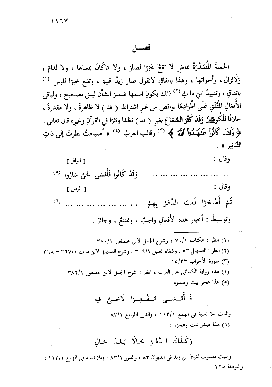 الجملة المصدرة بماض لا تقع خبرًا لصار، ولا مكان بمعناها، ولا لدام، ولا لزال، وأخواتها، وهذا باتفاق لا تقول صار زيد علم، وتقع خبرًا لليس باتفاق، وتقييد ابن مالك ذلك بكون اسمها ضمير الشأن ليس بصحيح، ولباقي الأفعال المتفق على اطرادها نواقص من غير اشتراط (قد) لا ظاهرة، ولا مقدرة، خلافًا للكوفيين وقد كثر السماع بغير (قد) نظمًا ونثرًا في القرآن وغيره قال تعالى: {ولقد كانوا عاهدوا الله} وقالت العرب «أصبحت نظرت على ذات التنانير».