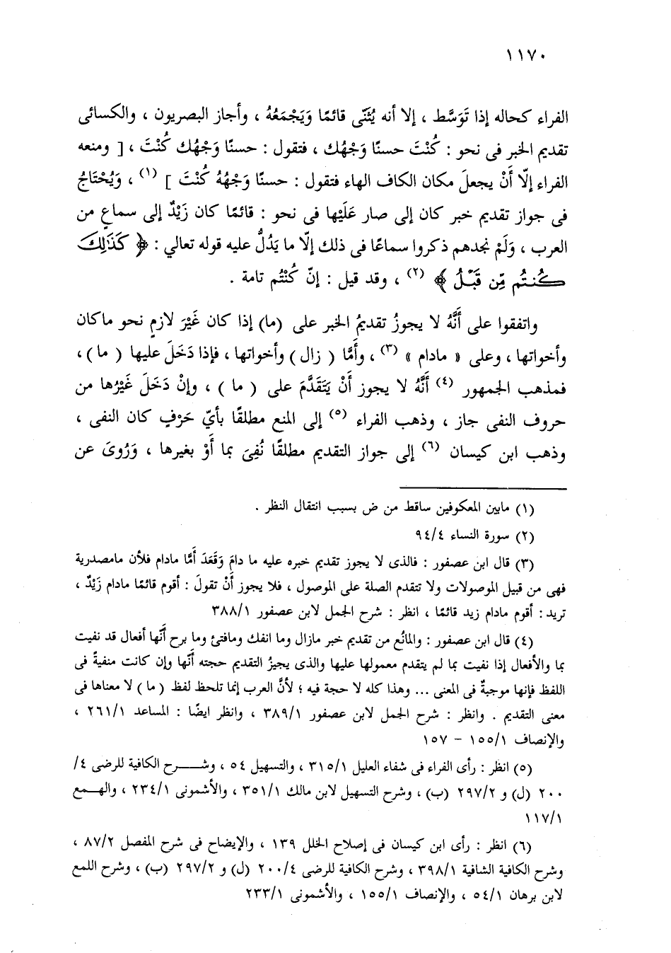 الفراء كحاله إذا توسط، غلا أنه يثنى قائمًا ويجمعه، وأجاز البصريون، والكسائي تقديم الخبر في نحو: كنت حسنًا وجهك، فتقول: حسنًا وجهك كنت، [ومنعه الفراء إلا أن يجعل مكان الكاف الهاء فتقول: حسنًا وجهه كنت]، ويحتاج في جواز تقديم خبر كان إلى صار عليها في نحو: قائمًا كان زيد إلى سماع من العرب، ولم نجدهم ذكروا سماعًا في ذلك إلا ما يدل عليه قوله تعالى: {كذلك كنتم من قبل}، وقد قيل: إن كنتم تامة.