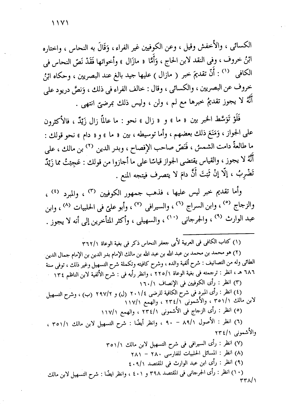 الكسائي، والأخفش وقيل، وعن الكوفيين غير الفراء، وقال به النحاس، واختاره ابن خروف، وفي النقد لابن الحاج، وأما «ما زال» وأخواتها فقد نص النحاس في الكافي: أن تقديم خبر (ما زال) عليها جيد بالغ عند البصريين، وحكاه ابن خروف عن البصريين، والكسائي، وقال: خالف الفراء في ذلك، ونص دريود على أنه لا يجوز تقديم خبرها مع لم، ولن، وليس ذلك بمرضي انتهى.