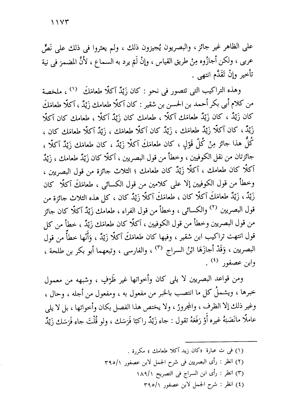 وهذه التراكيب التي تتصور في نحو: كان زيد آكلاً طعامك، ملخصة من كلام أبي بكر أحمد بن الحسن بن شقير: كان آكلاً طعامك زيد، آكلاً طعامك كان زيد، كان زيد طعامك آكلاً، طعامك كان زيد آكلاً، طعامك كان آكلاً زيد، كان آكلاً زيد طعامك، زيد كان آكلاً طعامك، زيد آكلاً طعامك كان، كل هذا جائز من كل قول، كان طعامك آكلاً زيد، كان طعامك زيد آكلاً، جائزتان من نقل الكوفيين، وخطأ من قول البصريين، آكلاً كان زيد طعامك، زيد آكلاً كان طعامك، آكلاً زيد كان طعامك؛ الثلاث جائزة من قول البصريين، وخطأ من قول الكوفيين غلا على كلامين من قول الكسائي، طعامك آكلاً كان زيد، زيد طعامك آكلاً كان، طعامك آكلاً زيد كان، كل هذه الثلاث جائزة من قول البصريين والكسائي، وخطأ من قول الفراء، طعامك زيد آكلاً كان جائز من قول البصريين وخطأ من قول الكوفيين، آكلاً كان طعامك زيد، خطأ من كل قول انتهت تراكيب ابن شقير، وفيها كان طعامك آكلاً زيد، وأنها خطأ من قول البصريين، وقد أجازها ابن السراج، والفارسي، وتبعهما أبو بكر بن طلحة، وابن عصفور.
