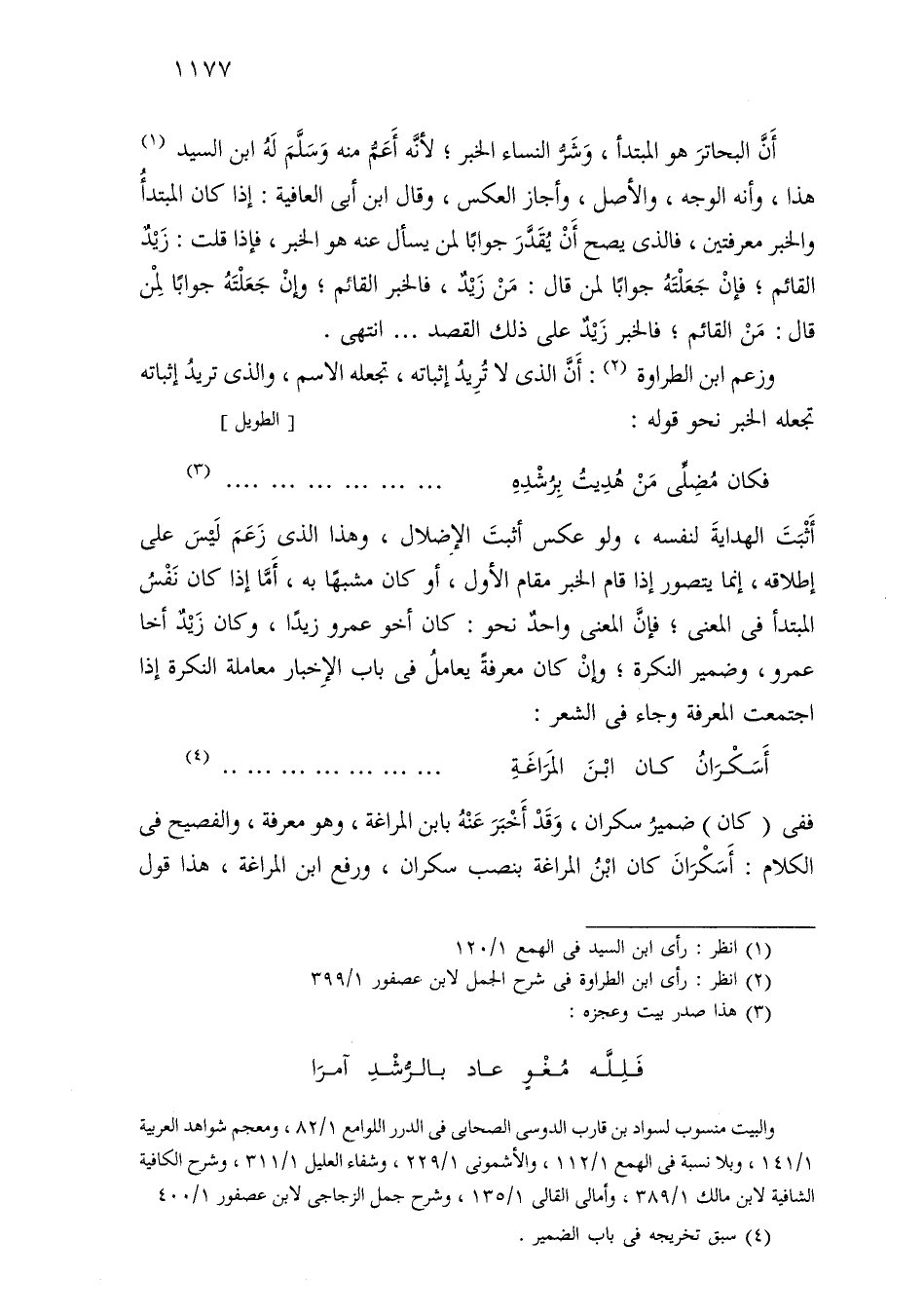 ففي (كان) ضمير سكران، وقد أخب رعنه بابن المراغة، وهو معرفة، والفصيح في الكلام: أسكران كان ابن المراغة بنصب سكران، ورفع ابن المراغة، هذا قول