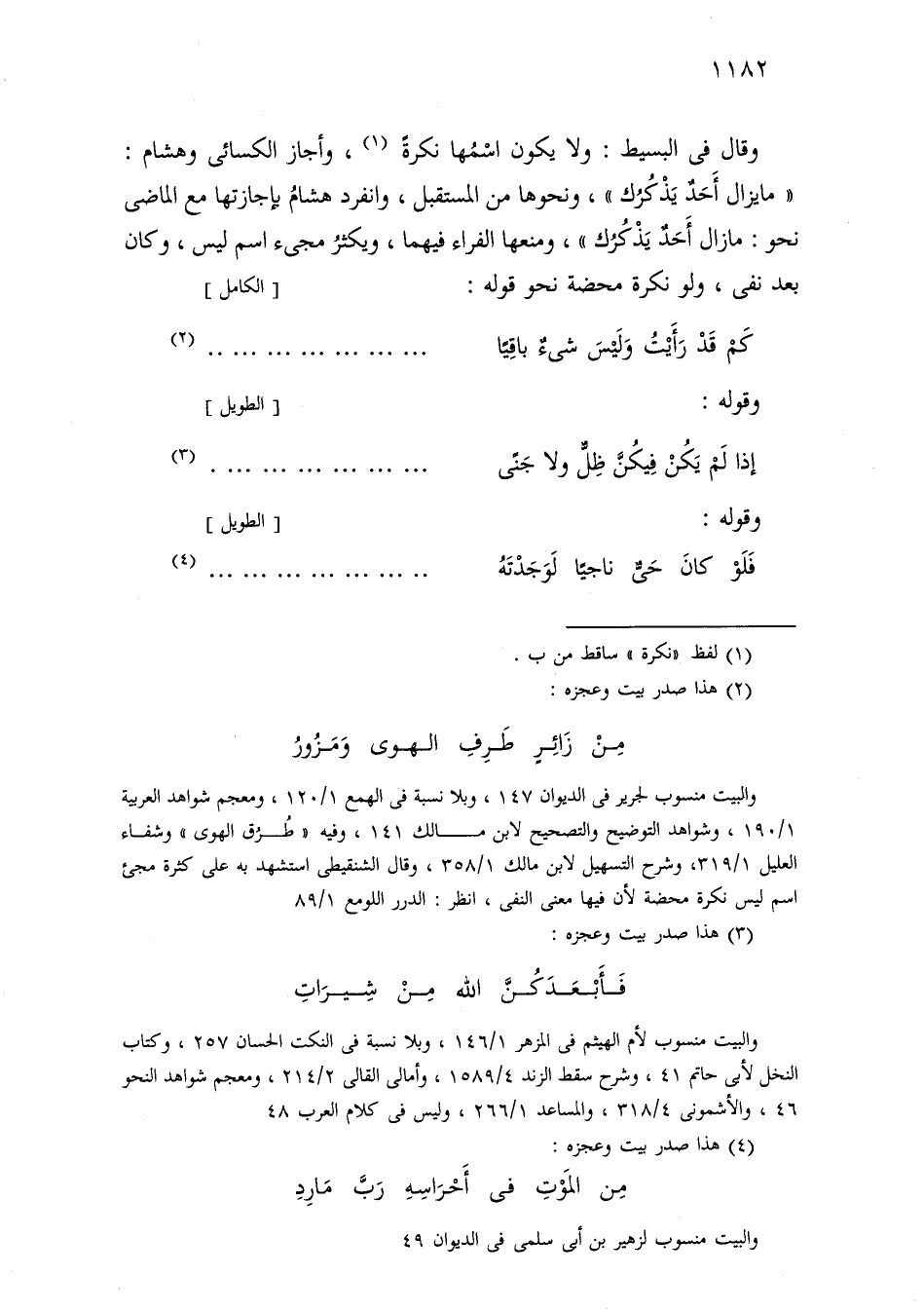 وقال في البسيط: ولا يكون اسمها نكرة، وأجاز الكسائي وهشام: «ما يزال أحد يذكرك»، ونحوها من المستقبل، وانفرد هشام بإجازتها مع الماضي نحو: ما زال أحد يذكرك، ومنعها الفراء فيهما، ويكثر مجيء اسم ليس، وكان بعد نفي، ولو نكرة محضة نحو قوله: