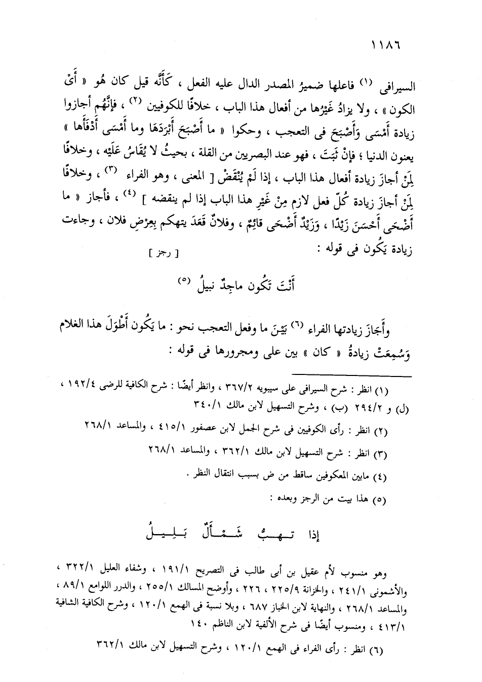 السيرافي فاعلها ضمير المصدر الدال عليه الفعل، كأن قيل كان هو «أي الكون»، ولا يزاد غيرها من أفعال هذا الباب، خلافًا للكوفيين، فإنهم أجازوا زيادة أمسى وأصبح في التعجب، وحكوا «ما أصبح أبردها وما أمسى أدفأها» يعنون الدنيا؛ فإن ثبت، فهو عند البصريين من القلة، بحيث لا يقاس عليه، وخلافًا لمن أجاز زيادة أفعال هذا الباب، إذا لم ينقض [المعنى، وهو الفراء، وخلافًا لمن أجاز زيادة كل فعل لازم من غير هذا الباب إذا لم ينقضه]، فأجاز «ما أضحى أحسن زيدًا، وزيد اضحى قائم، وفلان قعد يتهكم بعرض فلان، وجاءت زيادة يكون في قوله: