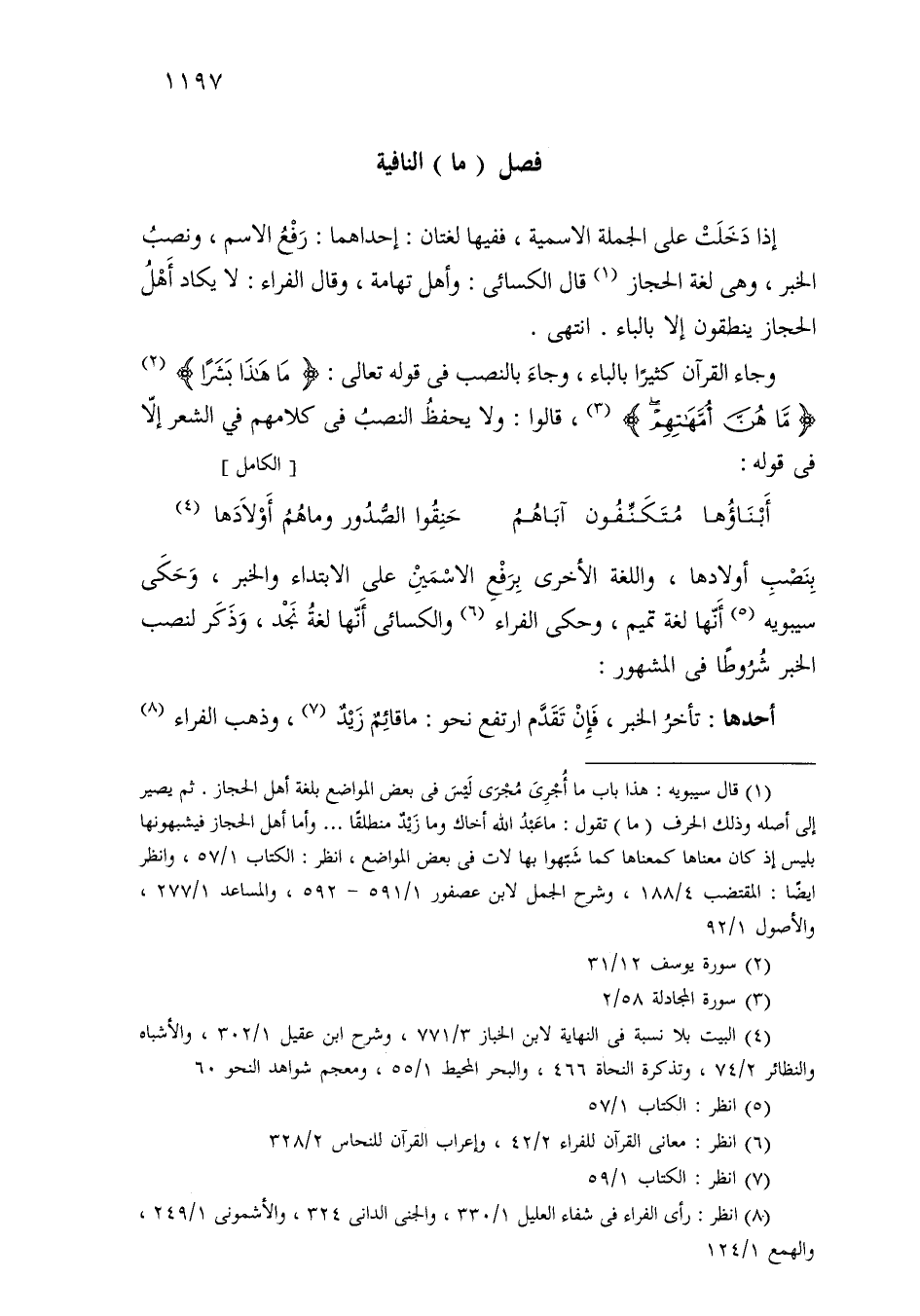 وجاء القرآن كثيرًا بالباء، وجاء بالنصب في قوله تعالى: {ما هذا بشرًا} {ما هن أمهاتهم}، قالوا: ولا يحفظ النصب في كلامهم في الشعر إلا في قوله: