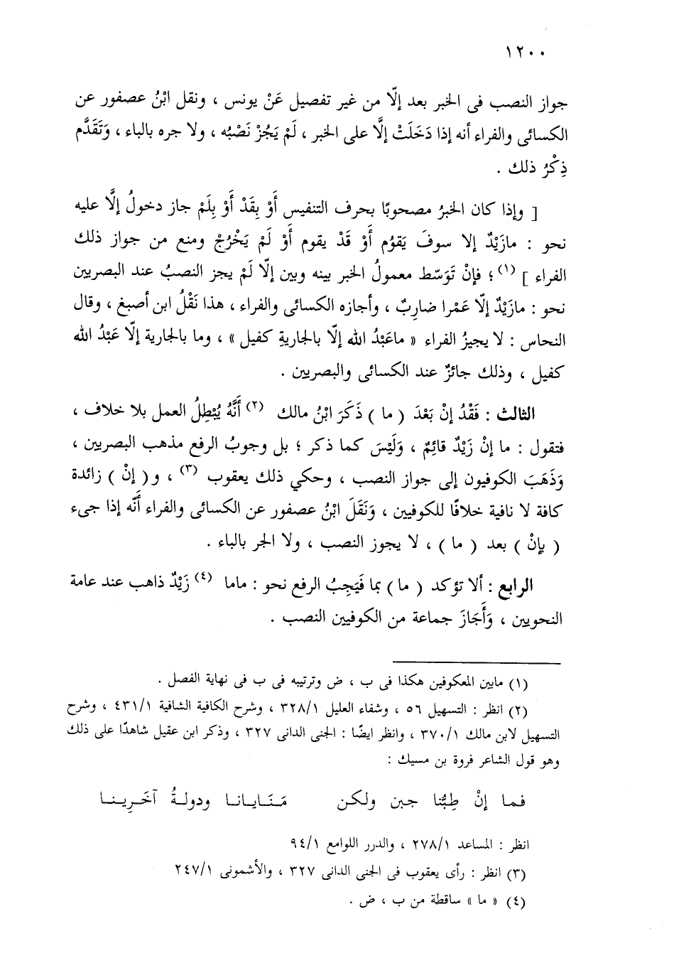 الثالث: فقد إن بعد (ما) ذكر ابن مالك أنه يبطل العمل بلا خلاف، فتقول: ما إن زيد قائم، وليس كما ذكر؛ بل وجوب الرفع مذهب البصريين، وذهب الكوفيون إلى جواز النصب، وحكي ذلك يعقوب، و (إن) زائدة كافة لا نافية خلافًا للكوفيين، ونقل ابن عصفور عن الكسائي والفراء أنه إذا جيء (بإن) بعد (ما)، لا يجوز النصب، ولا الجر بالباء.