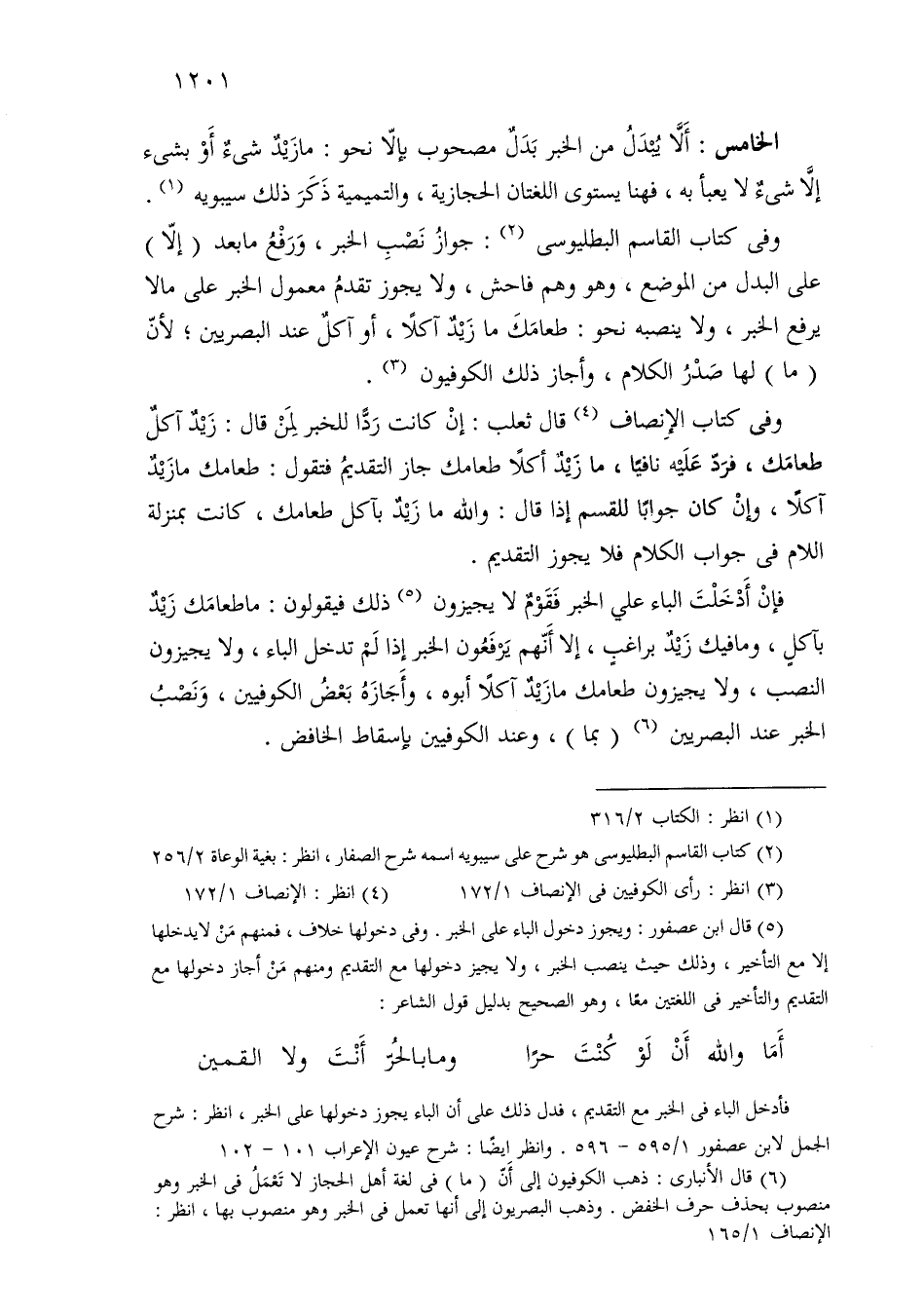 الخامس: ألا يبدل من الخبر بدل مصحوب بإلا نحو: ما زيد شيء أو بشيء إلا شيء لا يعبأ به، فهنا يستوي اللغتان الحجازية، والتميمية ذكر ذلك سيبويه.