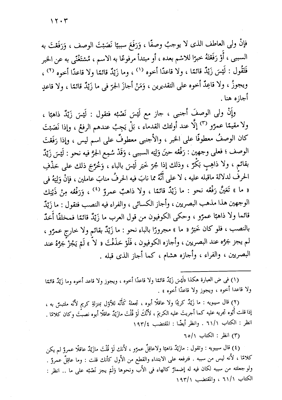 فإن ولى العاطف الذي لا يوجب وصفًا، ورفع سببًا نصبت الوصف، ورفعت به السببي، أو رفعته خبرًا للاسم بعده، أو مبتدأ مرفوعًا به الاسم، مستغنى به عن الخبر فتقول: ليس زيد قائمًا، ولا قاعدًا أخوه، وما زيد قائمًا ولا قاعدًا أخوه، ويجوز، ولا قاعد أخوه على التقديرين، ومن أجاز الجر في ما زيد قائمًا، ولا قاعد أجازه هنا.
