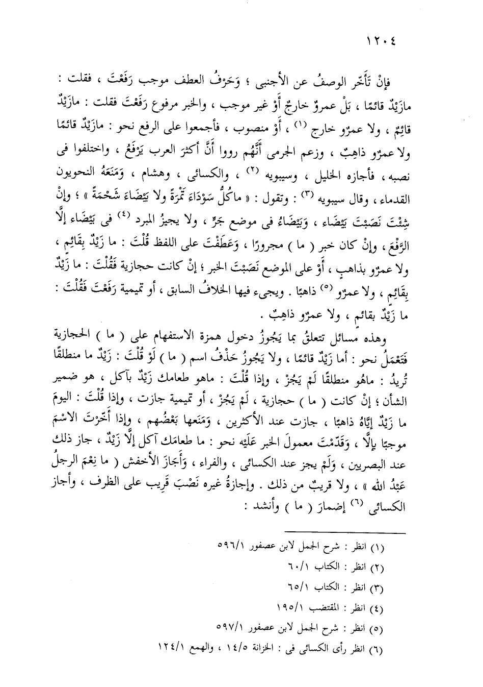 فإن تأخر الوصف عن الأجنبي؛ وحرف العطف موجب رفعت، فقلت: ما زيد قائمًا، بل عمرو خارج أو غير موجب، والخبر مرفوع رفعت فقلت: ما زيد قائم، ولا عمرو خارج، أو منصوب، فأجمعوا على الرفع نحو: ما زيد قائمًا ولا عمرو ذاهب، وزعم الجرمي أنهم رووا أن أكثر العرب يرفع، واختلفوا في نصبه، فأجازه الخليل، وسيبويه، والكسائي، وهشام، ومنعه النحويون القدماء، وقال سيبويه: وتقول: «ما كل سوداء تمرة ولا بيضاء شحمة»؛ وإن شئت نصبت بيضاء، وبيضاء في موضع جر، ولا يجيز المبرد في بيضاء إلا الرفع، وإن كان خبر (ما) مجرورًا، وعطفت على اللفظ قلت: ما زيد بقائم، ولا عمرو بذاهب، أو على الموضع نصبت الخبر؛ إن كانت حجازية فقتل: ما زيد بقائم، ولا عمرو ذاهبًا. ويجيء فيها الخلاف السابق، أو تميمية رفعت فقلت: ما زيد بقائم، ولا عمرو ذاهب.