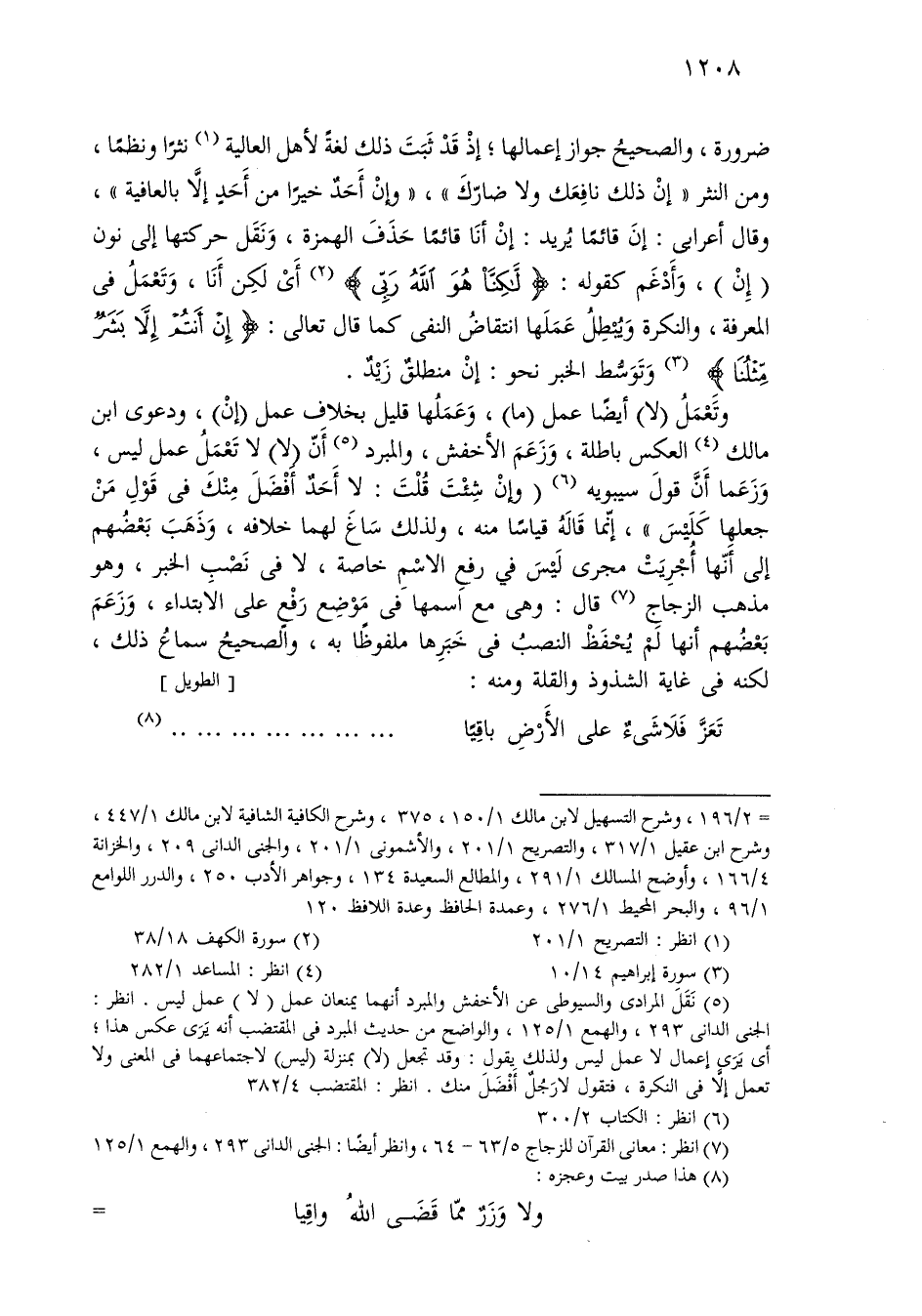 ضرورة، والصحيح جواز إعمالها؛ إذ قد ثبت ذلك لغة لأهل العالية نثرًا ونظمًا، ومن النثر «إن ذلك نافعك ولا ضارك»، «وإن أحد خيرًا من أحد إلا بالعافية»، وقال أعرابي: إن قائمًا يريد: إن أنا قائمًا حذف الهمزة، ونقل حركتها إلى نون (إن)، وأدغم كقوله: {لكنا هو الله ربي} أي لكن أنا، وتعمل في المعرفة والنكرة ويبطل عملها انتقاض النفي كما قال تعالى: {إن أنتم إلا بشر مثلنا} وتوسط الخبر نحو: إن منطلق زيد.