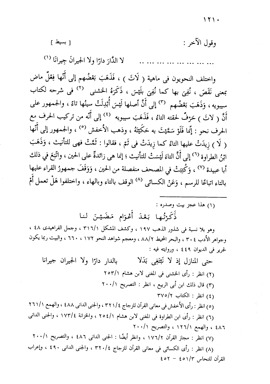 واختلف النحويون في ماهية (لات)، فذهب بعضهم إلى أنها فعل ماض بمعنى نقص، نفي بها كما نفي بليس، ذكره الخشني في شرحه لكتاب سيبويه، وذهب بعضهم إلى أن أصلها ليس أبدلت سينها تاء، والجمهور على أن (لات) حرف لحقته التاء، فذهب سيبويه إلى أنه من تركيب الحرف مع الحرف نحو: إنما فلو سميت به حكيته، وذهب الأخفش، والجمهور إلى أنها (لا) زيدت عليها التاء كما زيدت في ثم، فقالوا: ثمت فهي للتأنيث، وذهب ابن الطراوة إلى أن التاء ليست للتأنيث؛ إنما هي زائدة على الحين، واتبع في ذلك أبا عبيدة، وكتبت في المصحف منفصلة من الحين، ووقف جمهور القراء عليها بالتاء ابتاعًا للرسم، وعن الكسائي الوقف بالتاء وبالهاء، واختلفوا هل تعمل أم