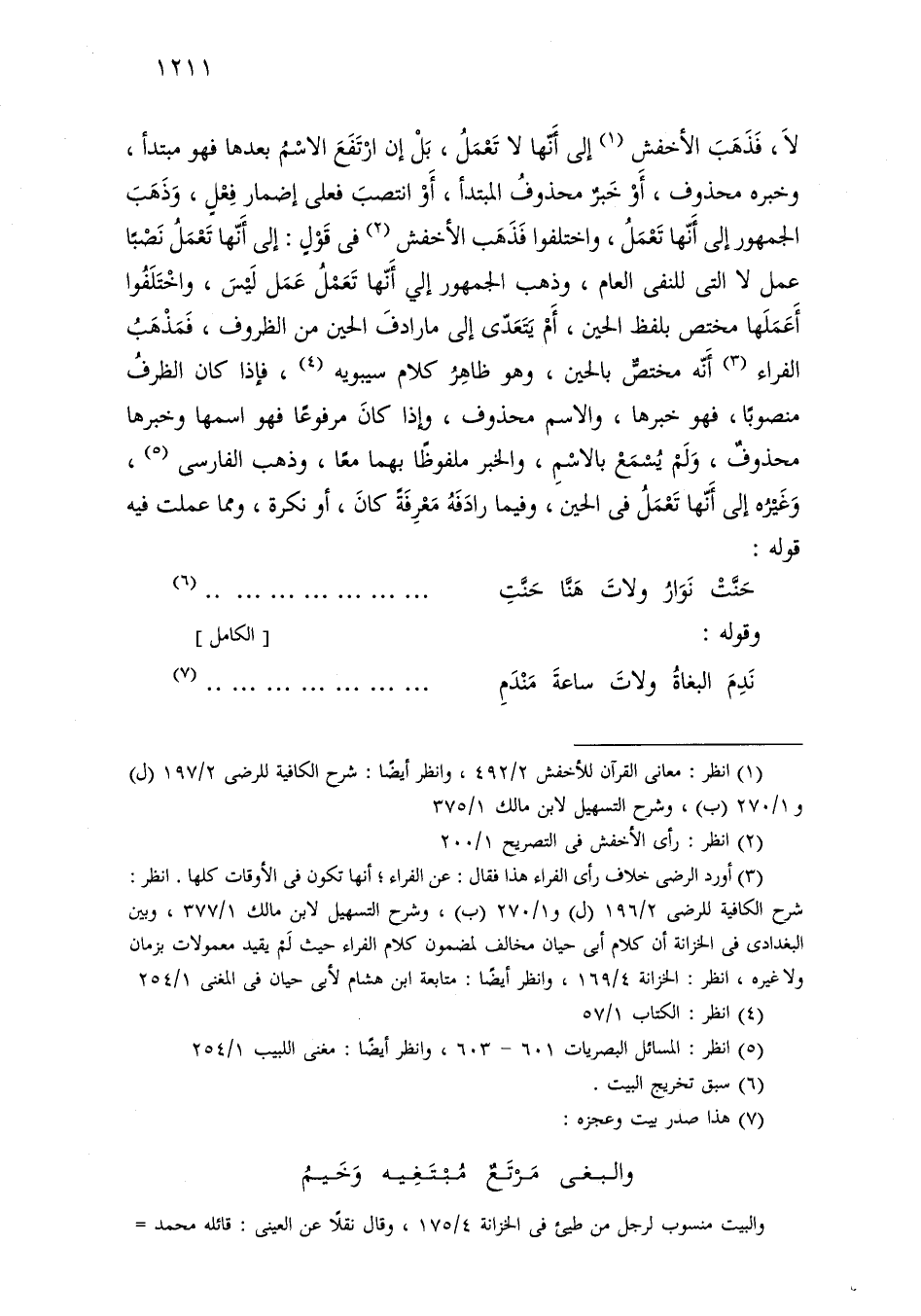 لا، فذهب الأخفش إلى أنها لا تعمل، بل إن ارتفع الاسم بعدها فهو مبتدأ، وخبره محذوف، أو خبر محذوف المبتدأ، أو انتصب فعلى إضمار فعل، وذهب الجمهور إلى أنها تعمل، واختلفوا فذهب الأخفش في قول: إلى أنها تعمل نصبًا عمل لا التي للنفي العام، وذهب الجمهور إلى أنها تعمل عمل ليس، واختلفوا أعملها مختص بلفظ الحين، أم يتعدى إلى ما رادف الحين من الظروف، فمذهب الفراء أنه مختص بالحين، وهو ظاهر كلام سيبويه، فإذا كان الظرف منصوبًا، فهو خبرها، والاسم محذوف، وإذا كان مرفوعًا فهو سامها وخبرها محذوف، ولم يسمع بالاسم، والخبر ملفوظًا بهما معًا، وذهب الفارسي، وغيره إلى أنها تعمل في الحين، وفيما رادفه معرفة كان، أو نكرة، ومما عملت فيه قوله:
