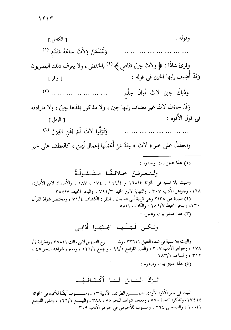 وقد جاءت لات غير مضاف إليها حين، ولا مذكور بعدها حين، ولا مرادفه في قول الأفوه: