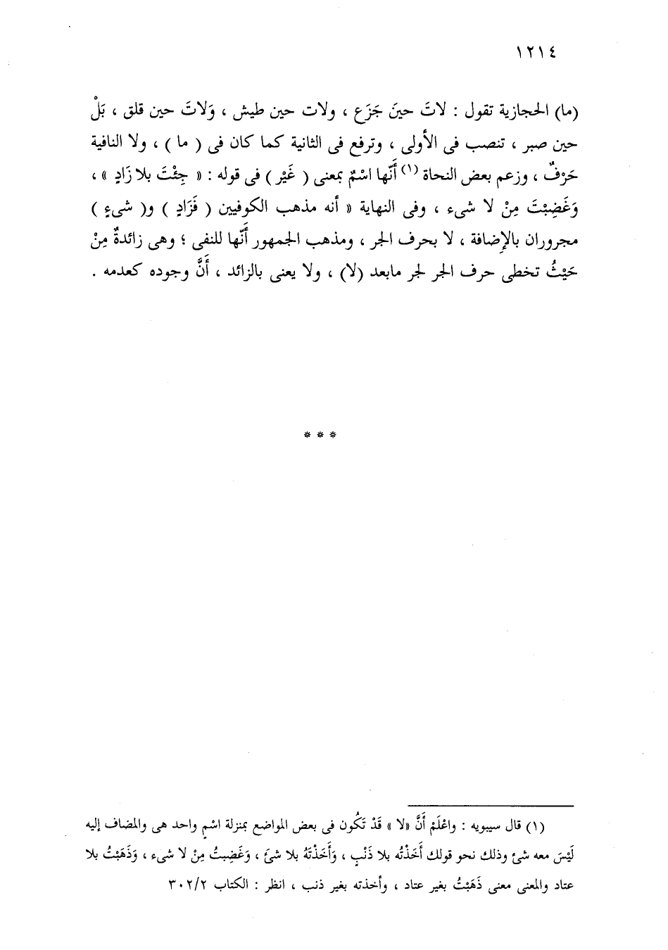 (ما) الحجازية تقول: لات حين جزع، ولات حين طيش، ولات حين قلق، بل حين صبر، تنصب في الأولى، وترفع في الثانية كما كان في (ما)، ولا النافية حرف، وزعم بعض النحاة أنها اسم بمعنى (غير) في قوله: «جئت بلا زاد»، وغضبت من لا شيء، وفي النهاية «أنه مذهب الكوفيين (فزاد) و (شيء) مجروران بالإضافة، لا بحرف الجر، ومذهب الجمهور أنها للنفي؛ وهي زائدة من حيث تخطى حرف الجر لجر ما بعد (لا)، ولا يعني بالزائد، أن وجوده كعدمه.