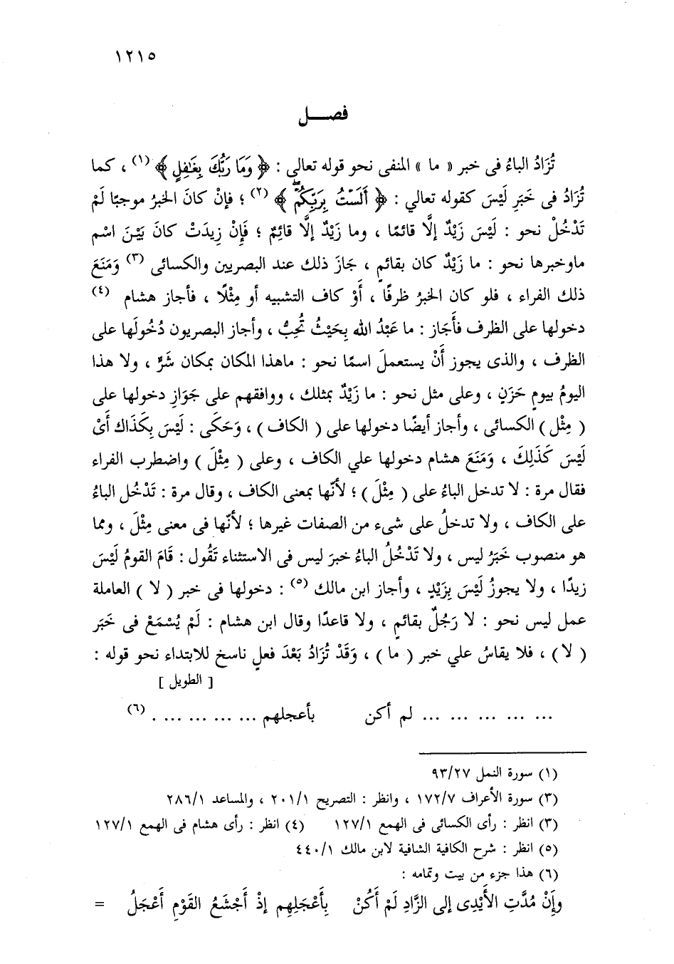 تزاد الباء في خبر «ما» المنفي نحو قوله تعالى: {وما ربك بغافل}، كما تزاد في خبر ليس كقوله تعالى: {ألست بربكم}؛ فإن كان الخبر موجبًا لم تدخل نحو: ليس زيد غلا قائمًا، وما زيد غلا قائم؛ فإن زيدت كان بين اسم ما وخبرها نحو: ما زيد كان بقائم، جاز ذلك عند البصريين والكسائي ومنع ذلك الفراء، فلو كان الخبر ظرفًا، أو كاف التشبيه أو مثلاً، فأجاز هشام دخولها على الظرف فأجاز: ما عبد الله بحيث تحب، وأجاز البصريون دخولها على الظرف، والذي يجوز أن يستعمل اسمًا نحو: ما هذا المكان بمكان شر، ولا هذا اليوم بيوم حزن، وعلى مثل نحو: ما زيد بمثلك، ووافقهم على جواز دخولها على (مثل) الكسائي، وأجاز أيضًا دخولها على (الكاف)، وحكى: ليس بكذاك أي ليس كذلك، ومنع هشام دخولها على الكاف، وعلى (مثل) واضطرب الفراء فقال مرة: لا تدخل الباء على (مثل)؛ لأنها بمعنى الكاف، وقال مرة: تدخل الباء على الكاف، ولا تدخل على شيء من الصفات غيرها؛ لأنها في معنى مثل، ومما هو منصوب خبر ليس، ولا تدخل الباء في خبر ليس في الاستثناء تقول: قام القوم ليس زيدًا، ولا يجوز ليس بزيد، وأجاز ابن مالك: دخولها في خبر (لا) العاملة عمل ليس نحو: لا رجل بقائم، ولا قاعدًا وقال ابن هشام: لم يسمع في خبر (لا)، فلا يقاس على خبر (ما)، وقد تزاد بعد فعل ناسخ للابتداء نحو قوله: