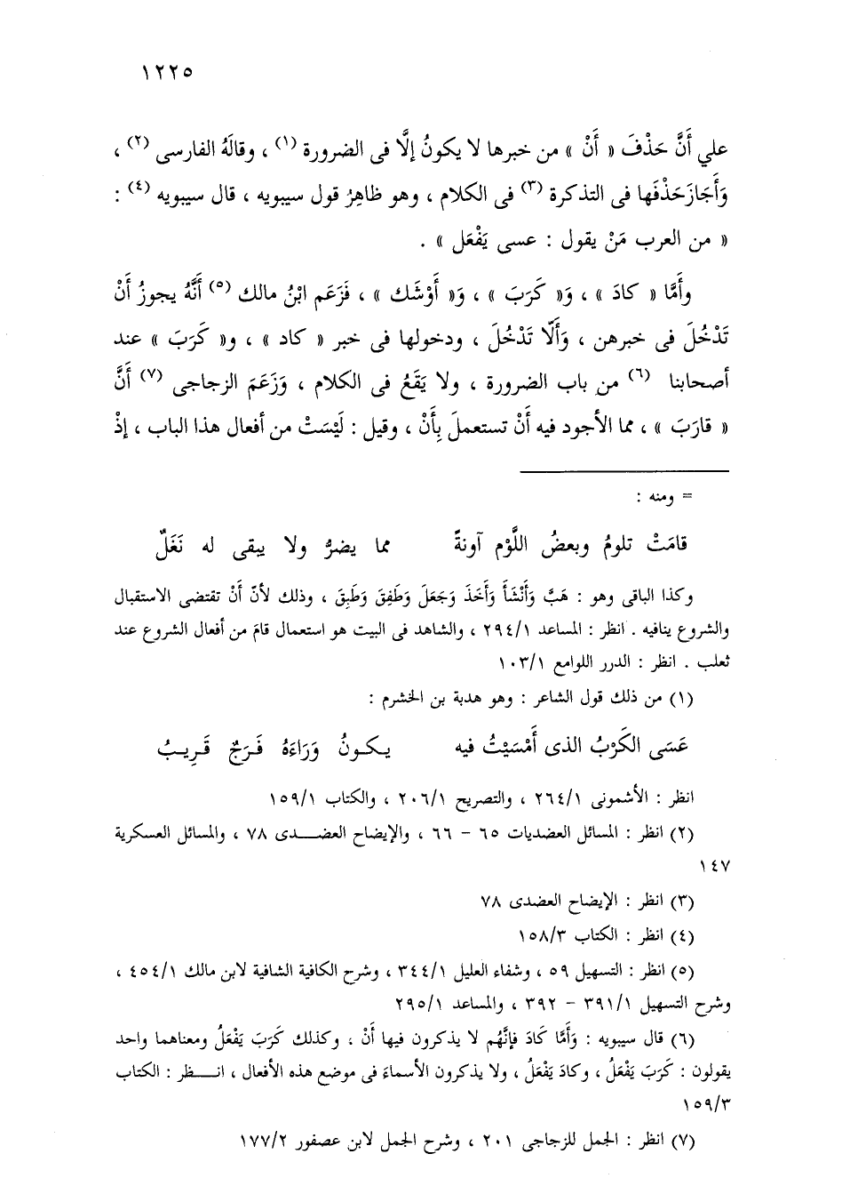 على أن حذف «أن» من خبرها لا يكون إلا في الضرورة، وقاله الفارسي، وأجاز حذفها في التذكرة في الكلام، وهو ظاهر قول سيبويه، قال سيبويه: «من العرب من يقول: عسى يفعل».