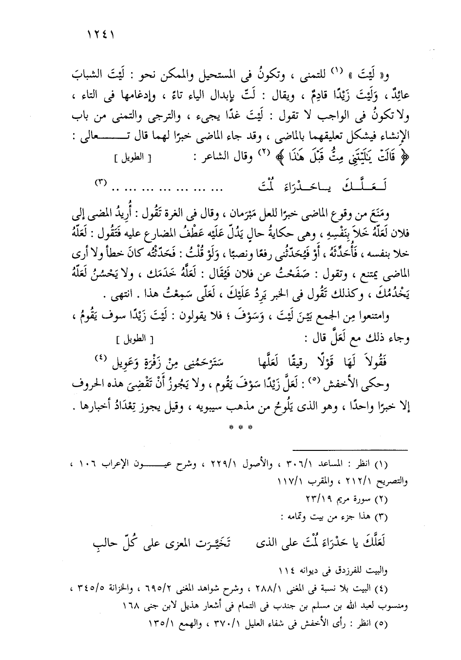 و «ليت» للتمني، وتكون في المستحيل والممكن نحو: ليت الشباب عائد، وليت زيدًا قادم، ويقال: لت بإبدال الياء تاء، وإدغامها في التاء، ولا تكون في الواجب لا تقول: ليت غدًا يجيء، والترجي والتمني من باب الإنشاء فيشكل تعليقهما بالماضي، وقد جاء الماضي خبرًا لهما قال تعالى: «قالت يا ليتني مت قبل هذا» وقال الشاعر: