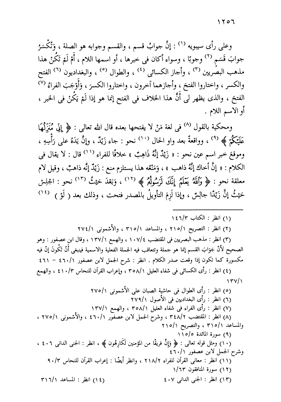 وعلى رأي سيبويه: إن جواب قسم، والقسم وجوابه هو الصلة، وتكسر جواب قسم وجوبًا، وسواء أكان في خبرها، أو اسمها اللام، أم لم تكن هذا مذهب البصريين، وأجاز الكسائي، والطوال، والبغداديون الفتح والكسر، واختاروا الفتح، وأجازهما آخرون، واختاروا الكسر، وأوجب الفراء الفتح، والذي يظهر لي أن هذا الخلاف في الفتح إنما هو إذا لم يكن في الخبر، أو الاسم اللام.