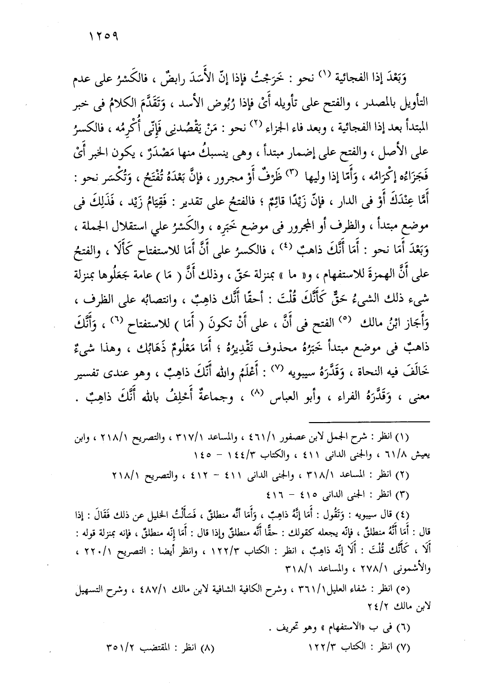 وبعد إذا الفجائية نحو: خرجت فإذا إن الأسد رابض، فالكسر على عدم التأويل بالمصدر، والفتح على تأويله أي فإذا ربوض الأسد، وتقدم الكلام في خبر المبتدأ بعد إذا الفجائية، وبعد فاء الجزاء نحو: من يقصدني فإني أكرمه، فالكسر على الأصل، والفتح على إضمار مبتدأ، وهي ينسبك منها مصدر، يكون الخبر أي فجزاءه إكرامه، وأما إذا وليها ظرف أو مجرور، فإن بعده تفتح، وتكسر نحو: أما عندك أو في الدار، فإن زيدًا قائم؛ فالفتح على تقدير: فقيام زيد، فذلك في موضع مبتدأ، والظرف أو المجرور في موضع خبره، والكسر على استقلال الجملة، وبعد أما نحو: أما أنك ذاهب، فالكسر على أن أما للاستفتاح كألا، والفتح على أن الهمزة للاستفهام، و «ما» بمنزلة حق، وذلك أن (ما) عامة جعلوها بمنزلة شيء ذلك الشيء حق كأنك قلت: أحقًا أنك ذاهب، وانتصابه على الظرف، وأجاز ابن مالك الفتح في أن، على أن تكون (أما) للاستفتاح، وأنك ذاهب في موضع مبتدأ خبره محذوف تقديره؛ أما معلوم ذهابك، وهذا شيء خالف فيه النحاة، وقدره سيبويه: أعلم والله أنك ذاهب، وهو عندي تفسير معنى، وقدره الفراء، وأبو العباس، وجماعة أحلف بالله أنك ذاهب.