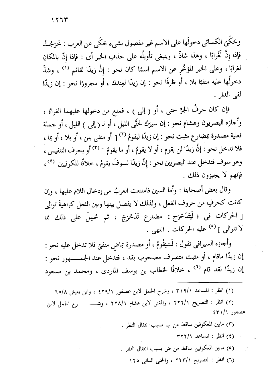 فإن كان حرف الجر حتى، أو (إلى)، فمنع من دخولها عليهما الفراء، وأجازه البصريون وهشام نحو: إن سيرك لحتى الليل، أو لـ (إلى) الليل، أو جملة فعلية مصدرة بمضارع مثبت نحو: إن زيدًا ليقوم [أو منفي بلن، أو بلا، أو بما، فلا تدخل نحو: إن زيدًا لن يقوم، أو لا يقوم، أو ما يقوم] أو بحرف التنفيس، وهو سوف فتدخل عند البصريين نحو: إن زيدًا لسوف يقوم، خلافًا للكوفيين، فإنهم لا يجيزون ذلك.