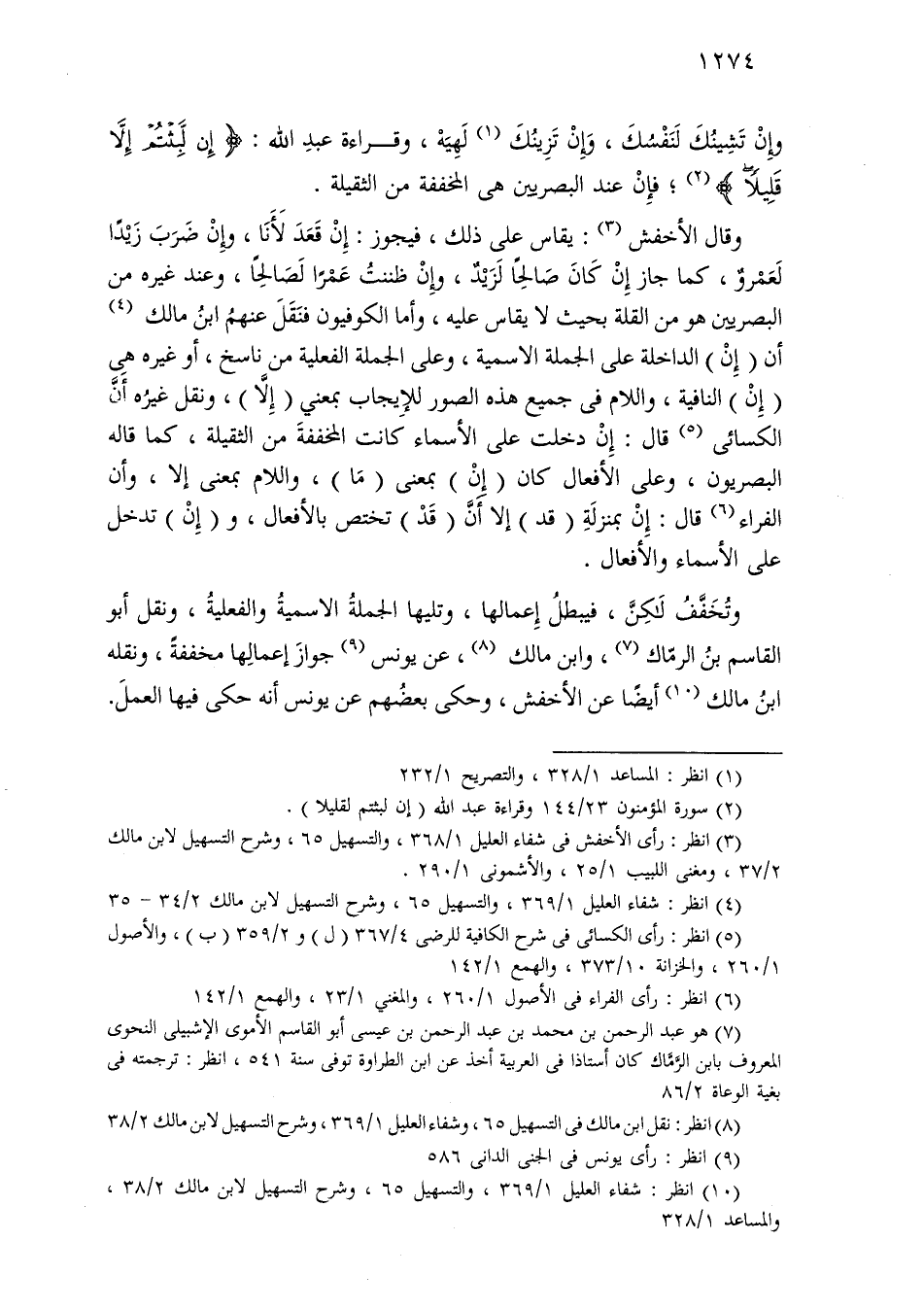 وإن تشينك لنفسك، وإن تزينك لهية، وقراءة عبد الله: «إن لبثتم إلا قليلا»؛ فإن عند البصريين هي المخففة من الثقيلة.