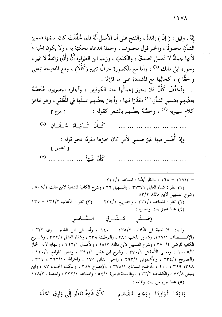 وتخفف كأن فلا يجوز إعمالها عند الكوفيين، وأجازه البصريون فخصه بعضهم بضمير الشأن مقدرًا فيها، وأجاز بعضهم عملها في المظهر، وهو ظاهر كلام سيبويه، وخصه بعضهم بالشعر كقوله: