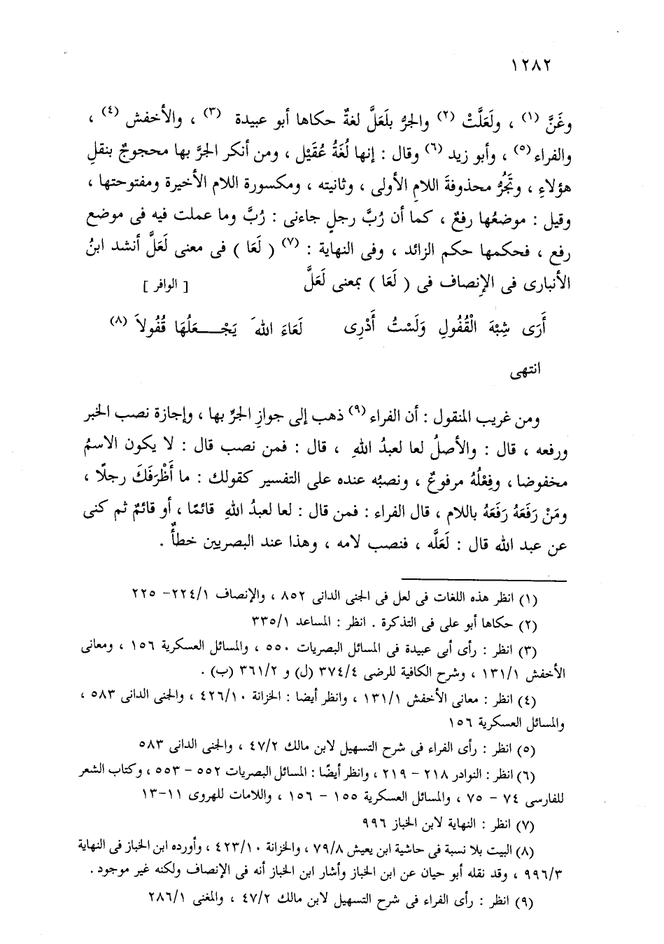 ومن غريب المنقول: أن الفراء ذهب إلى جواز الجر بها، وإجازة نصب الخبر ورفعه، قال: والأصل لعا لعبد الله، قال: فمن نصب قال: لا يكون الاسم مخفوضًا، وفعله مرفوع، ونصبه عنده على التفسير كقولك: ما أظرفك رجلاً، ومن رفعه رفعه باللام، قال الفراء: فمن قال: لعا لعبد الله قائمًا، أو قائم ثم كني عن عبد الله قال: لعله، فنصب لامه، وهذا عند البصريين خطأ.