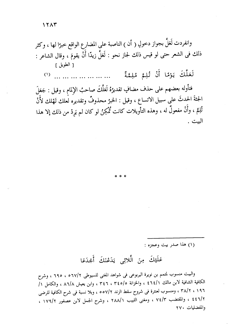 فتأوله بعضهم على حذف مضاف تقديره لعلك صاحب الإلمام، وقيل: جعل الجثة الحدث على سبيل الاتساع، وقيل: الخبر محذوف وتقديره لعلك تهلك لأن تلم، وأن مفعول له، وهذه التأويلات كانت تمكن لو كان لم يرد من ذلك إلا هذا البيت.