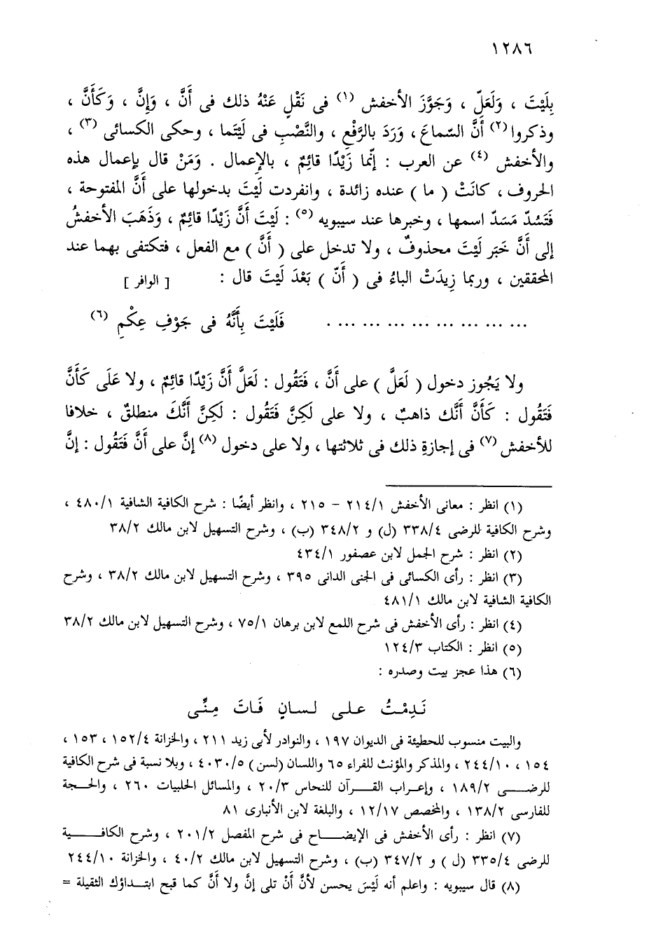 بليت، ولعل، وجوز الأخفش في نقل عنه ذلك في أن، وإن، وكأن، وذكروا أن السماع، ورد بالرفع، والنصب في ليتما، وحكى الكسائي، والأخفش عن العرب: إنما زيدًا قائم، بالإعمال. ومن قال بإعمال هذه الحروف، كانت (ما) عنده زائدة، وانفردت ليت بدخولها على أن المفتوحة، فتسد مسد اسمها، وخبرها عند سيبويه: ليت أن زيدًا قائم، وذهب الأخفش إلى أن خبر ليت محذوف، ولا تدخل على (أن) مع الفعل، فتكتفي بهما عند المحققين، وربما زيدت الباء في (أن) بعد ليت قال: