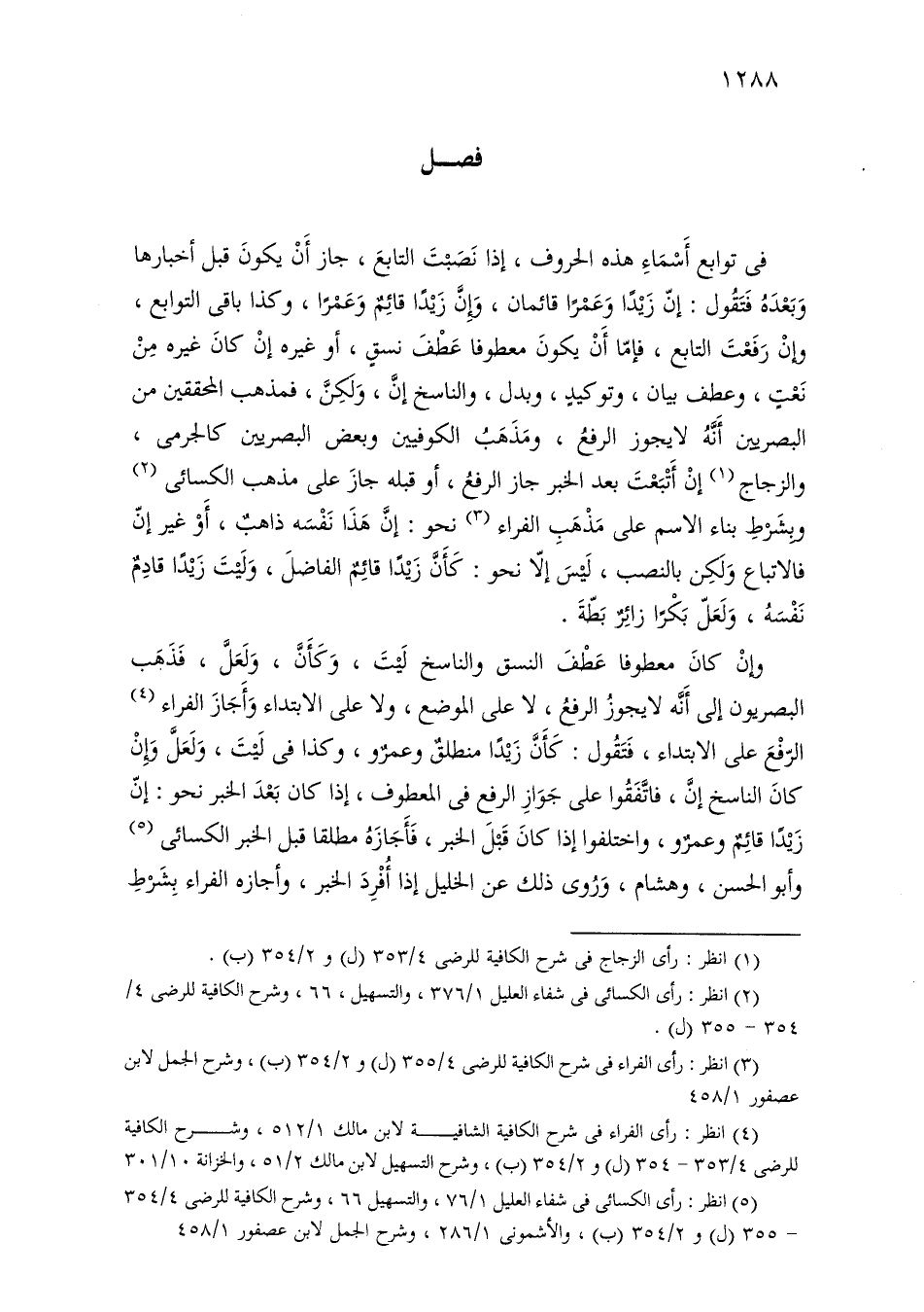 في توابع أسماء هذه الحروف، إذا نصبت التابع، جاز أن يكون قبل أخبارها وبعده فتقول: إن زيدًا وعمرًا قائمان، وإن زيدًا قائم وعمرًا، وكذا باقي التوابع، وإن رفعت التابع، فإما أن يكون معطوفًا عطف نسق، أو غيره إن كان غيره من نعت، وعطف بيان، وتوكيد، وبدل، والناسخ إن، ولكن، فمذهب المحققين من البصريين أنه لا يجوز الرفع، ومذهب الكوفيين وبعض البصريين كالجرمي، والزجاج إن أتبعت بعد الخبر جاز الرفع، أو قبله جاز على مذهب الكسائي وبشرط بناء الاسم على مذهب الفراء نحو: إن هذا نفسه ذاهب، أو غير إن فالاتباع ولكن بالنصب، ليس إلا نحو: كأن زيدًا قائم الفاضل، وليت زيدًا قادم نفسه، ولعل بكرًا زائر بطة.