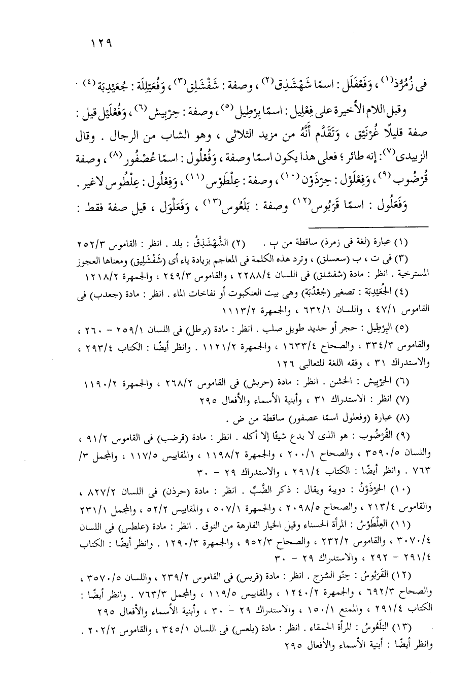 وقبل اللام الأخيرة على فعليل: اسمًا برطيل، وصفة: حربيش، وفعليل قيل: صفة قليلاً غرنيق، وتقدم أنه من مزيد الثلاثي، وهو الشاب من الرجال. وقال الزبيدي: إنه طائر؛ فعلى هذا يكون اسمًا وصفة، وفعلول: اسمًا عصفور، وصفة قرضوب، وفعلول: حرذون، وصفة: علطوس، وفعلول: علطوس لا غير.