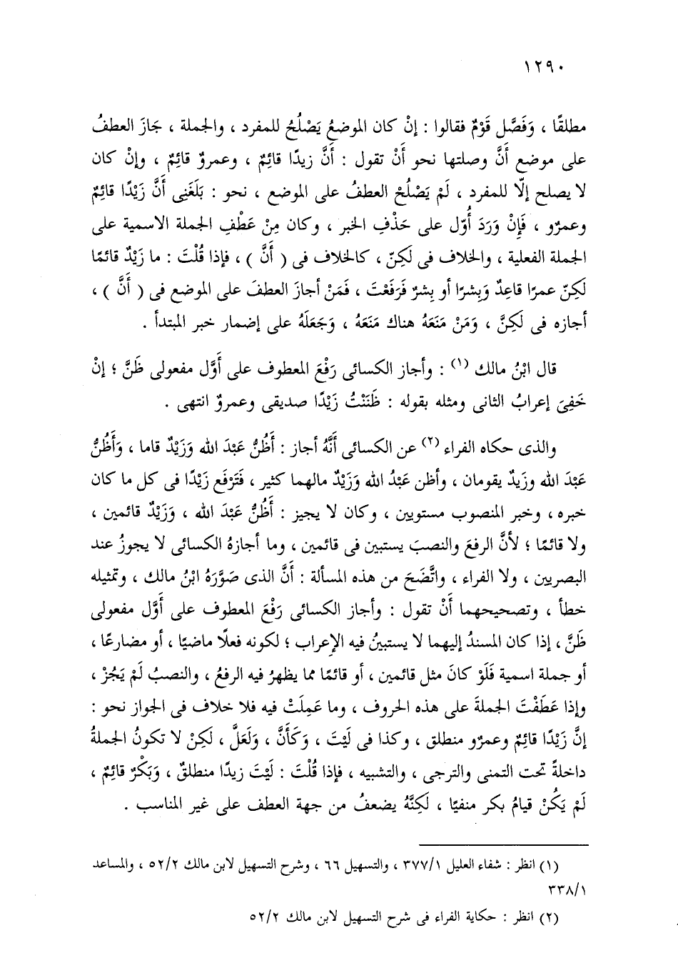 والذي حكاه الفراء عن الكسائي أنه أجاز: أظن عبد الله وزيد قاما، وأظن عبد الله وزيد يقومان، وأظن عبد الله وزيد مالهما كثير، فترفع زيدًا في كل ما كان خبره، وخبر المنصوب مستويين، وكان لا يجيز: أظن عبد الله، وزيد قائمين، ولا قائمًا؛ لأن الرفع والنصب بستين في قائمين، وما أجازه الكسائي لا يجوز عند البصريين، ولا الفراء، واتضح من هذه المسألة: أن الذي صوره ابن مالك، وتمثيله خطأ، وتصحيحهما أن تقول: وأجاز الكسائي رفع المعطوف على أول مفعولي ظن، إذا كان المسند إليهما لا يستبين فيه الإعراب؛ لكونه فعلاً ماضيًا، أو مضارعًا، أو جملة اسمية فلو كان مثل قائمين، أو قائمًا مما يظهر فيه الرفع، والنصب لم يجز، وإذا عطفت الجملة على هذه الحروف، وما عملت فيه فلا خلاف في الجواز نحو: إن زيدًا قائم وعمرو منطلق، وكذا في ليت، وكأن، ولعل، لكن لا تكون الجملة داخلة تحت التمني والترجي، والتشبيه، فإذا قلت: ليت زيدًا منطلق، وبكر قائم، لم يكن قيام بكر منفيًا، لكنه يضعف من جهة العطف على غير المناسب.