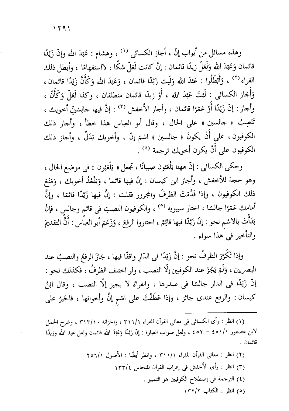 وهذه مسائل من أبواب إن، أجاز الكسائي، وهشام: عبد الله وإن زيدًا قائمان وعبد الله ولعل زيدًا قائمان: إن كانت لعل شكا، لا استفهامًا، وأبطل ذلك الفراء، وأبطلوا: عبد الله وليت زيدًا قائمان، وعبد الله وكأن زيدًا قائمان، وأجاز الكسائي: ليت عبد الله، أو زيدًا قائمان منطلقًا، وكذا لعل وكأن، وأجاز: إن زيدًا أو عمرًا قائمان، وأجاز الأخفش: إن فيها جالسين أخويك، تنصب «جالسين» على الحال، وقال أبو العباس هذا خطأ، وأجاز ذلك الكوفيون، على أن يكون «جالسين» اسم إن، وأخويك بدل، وأجاز ذلك الكوفيون على أن يكون أخويك ترجمة.