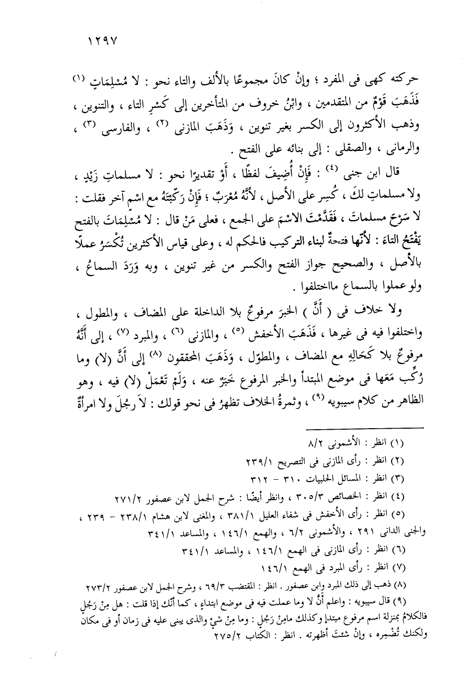 قال ابن جني: فإن أضيف لفظًا، أو تقديرًا نحو: لا مسلمات زيد، ولا مسلمات لك، كسر على الأصل، لأنه معرب؛ فإن ركبته مع اسم آخر فقلت: لا سرح مسلمات، فقدمت الاسم على الجمع، فعلى من قال: لا مسلمات بالفتح يفتح التاء: لأنها فتحة لبناء التركيب فالحكم له، وعلى قياس الأكثرين تكسر عملاً بالأصل، والصحيح جواز الفتح والكسر من غير تنوين، وبه ورد السماع، ولو ملوا بالسماع ما اختلفوا.