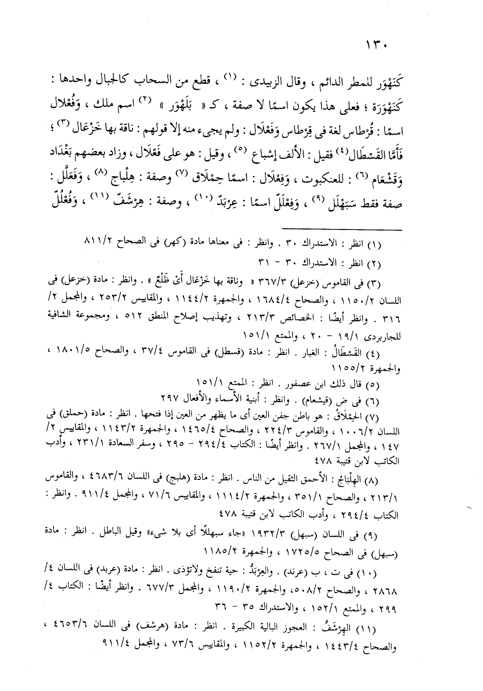 كنهور للمطر الدائم، وقال الزبيدي: قطع من السحاب كالجبال واحدها: كنهورة؛ فعلى هذا يكون اسمًا لا صفة، كـ «بلهور» اسم ملك، وفعلال اسمًا: قرطاس لغة في قرطاس وفعلال: ولم يجيء منه إلا قولهم: ناقة بها خزعال؛ فأما القسطال فقيل: الألف إشباع، وقيل: هو على فعلال، وزاد بعضهم بغداد وقشعام: للعنكبوت، وفعلال: اسمًا حملاق وصفة: هلباج، وفعلل: صفة فقط سبهلل، وفعلل اسمًا: عربد، وصفة: هرشف، وفعلل