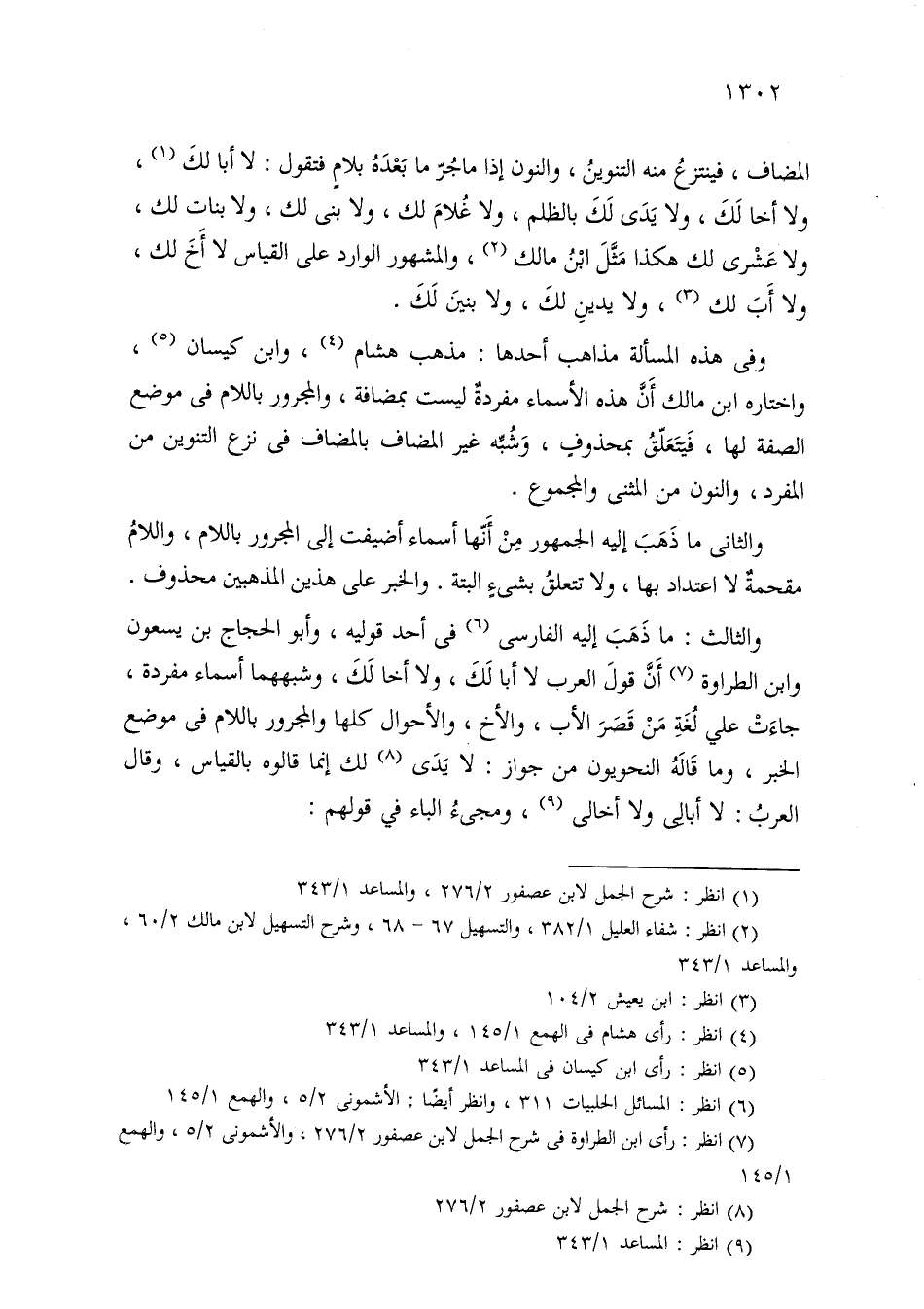وفي هذه المسألة مذاهب أحدها: مذهب هشام، وابن كيسان، واختاره ابن مالك أن هذه الأسماء مفردة ليست بمضافة، والمجرور باللام في موضع الصفة لها، فيتعلق بمحذوف، وشبه غير المضاف بالمضاف في نزع التنوين من المفرد، والنون من المثنى والمجموع.